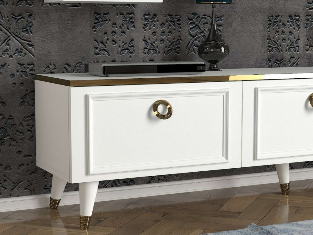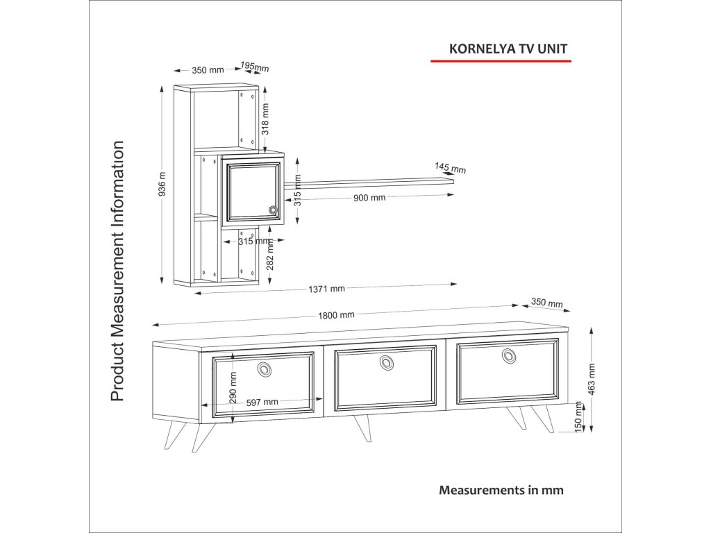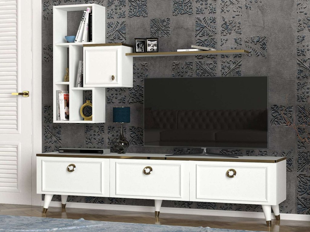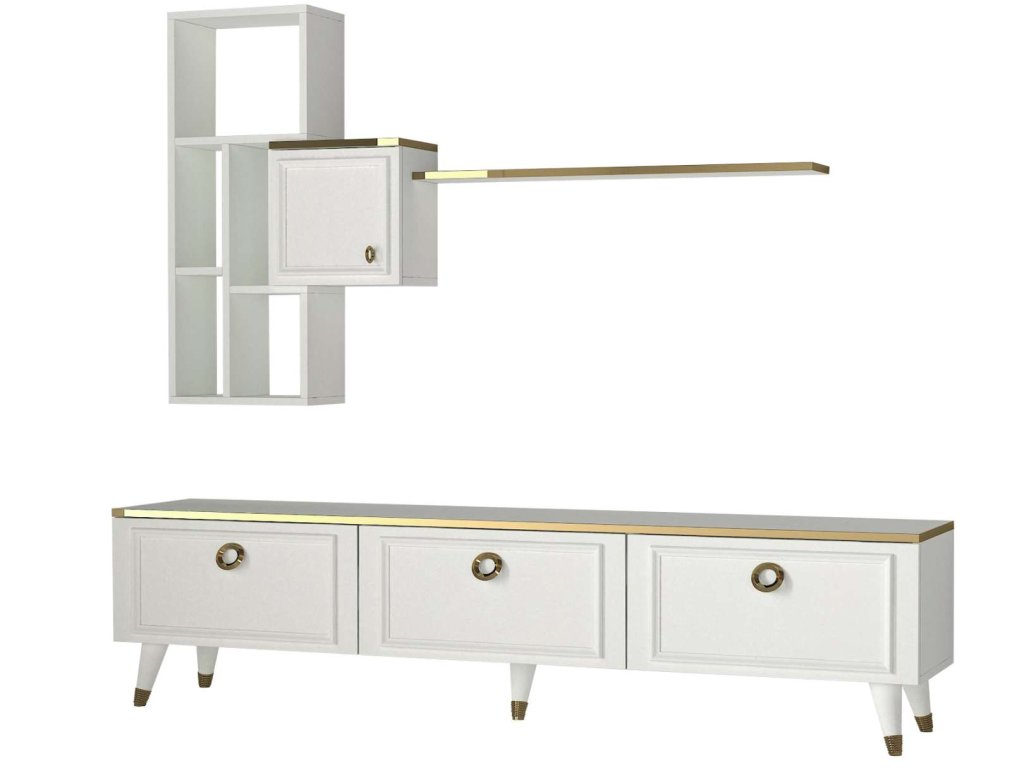 - Sestava obsahuje: TV stolek (180 x 35 x 46,5 cm) a nástěnné police (137 x 20 x 94 cm), které nabízejí praktické úložné řešení pro vaši elektroniku a dekorace.