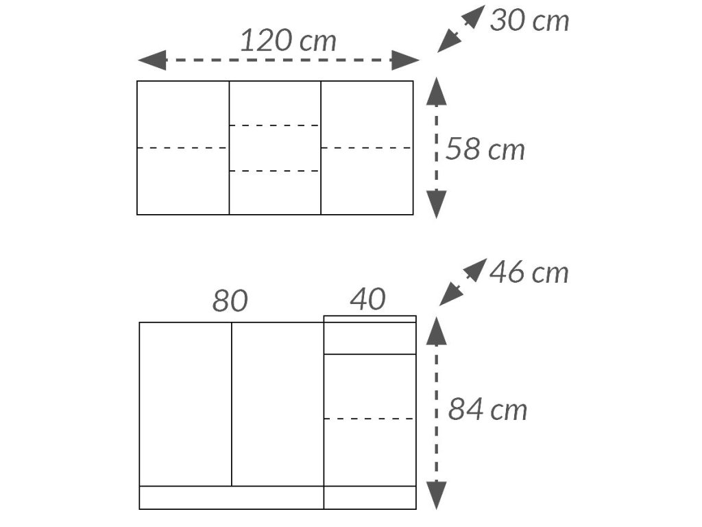a vrchní skříňky: - šířka 120 cm, výška 58 cm, hloubka 30 cm.