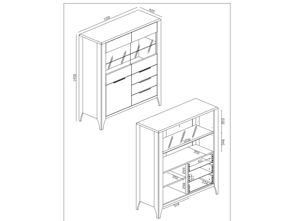 Komoda disponuje třemi šuplíky a třemi dvířky, z nichž dvě jsou prosklená, což umožňuje vystavit vaše nejcennější předměty a zároveň uschovat ostatní věci. Díky rozměrům výška 110 cm, šířka 145 cm a hloubka 42 cm poskytuje dostatek úložného prostoru, aniž by zabírala příliš místa.