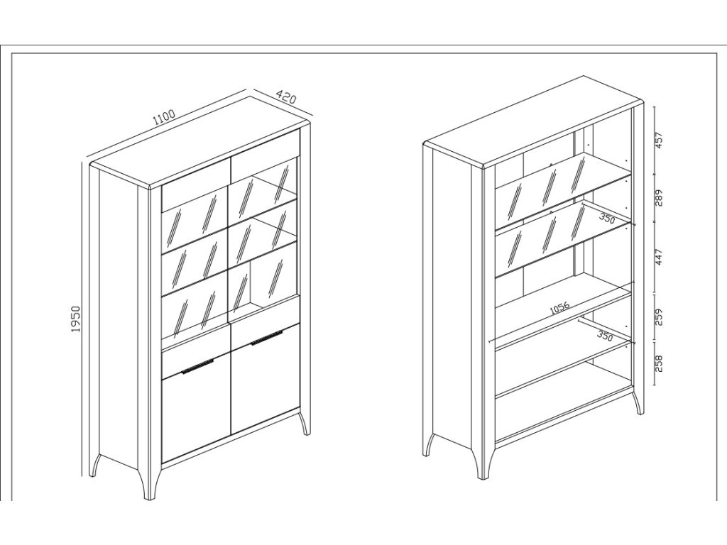Rozměry vitríny jsou výška 195 cm, šířka 110 cm a hloubka 42 cm, což zaručuje, že nezabere příliš místa, ale zároveň nabídne dostatek úložného prostoru. Vitrína stojí na elegantních nožičkách, které jí dodávají lehkost a moderní vzhled.