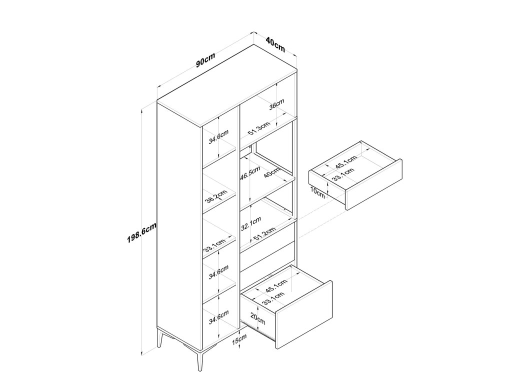 - Rozměry: 198,6 x 90 x 40 cm – vysoká konstrukce, která nabízí velkorysý úložný prostor.