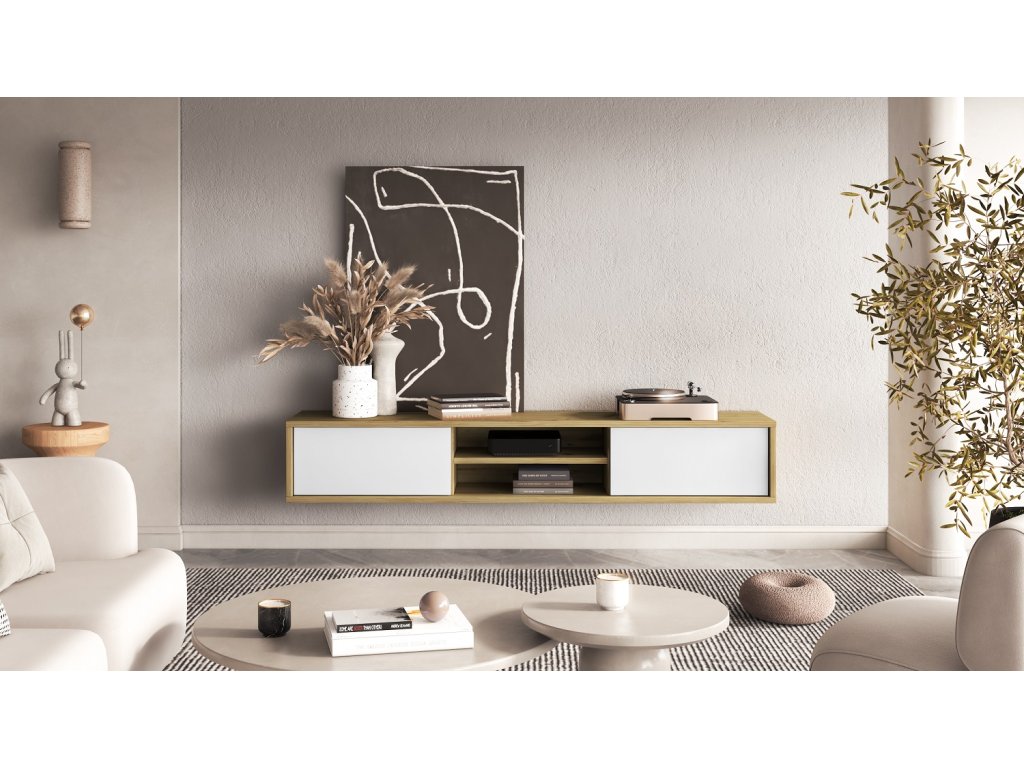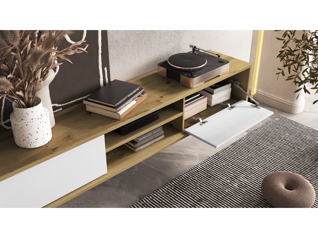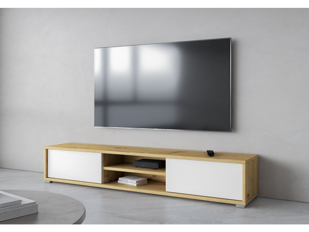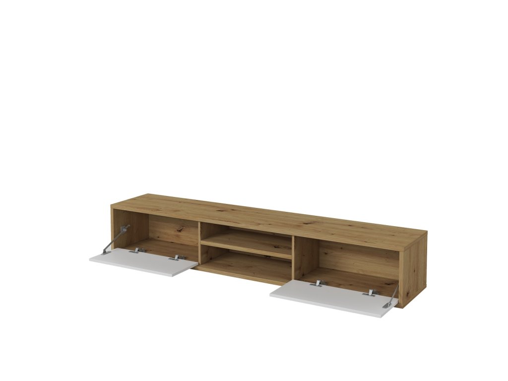 TV stolek je vyroben z kvalitních LTD desek, které se snadno udržují. TV stolek diposnuje dvěma výklopnými přihrádkami a dvěma otevřenými přihrádkami.