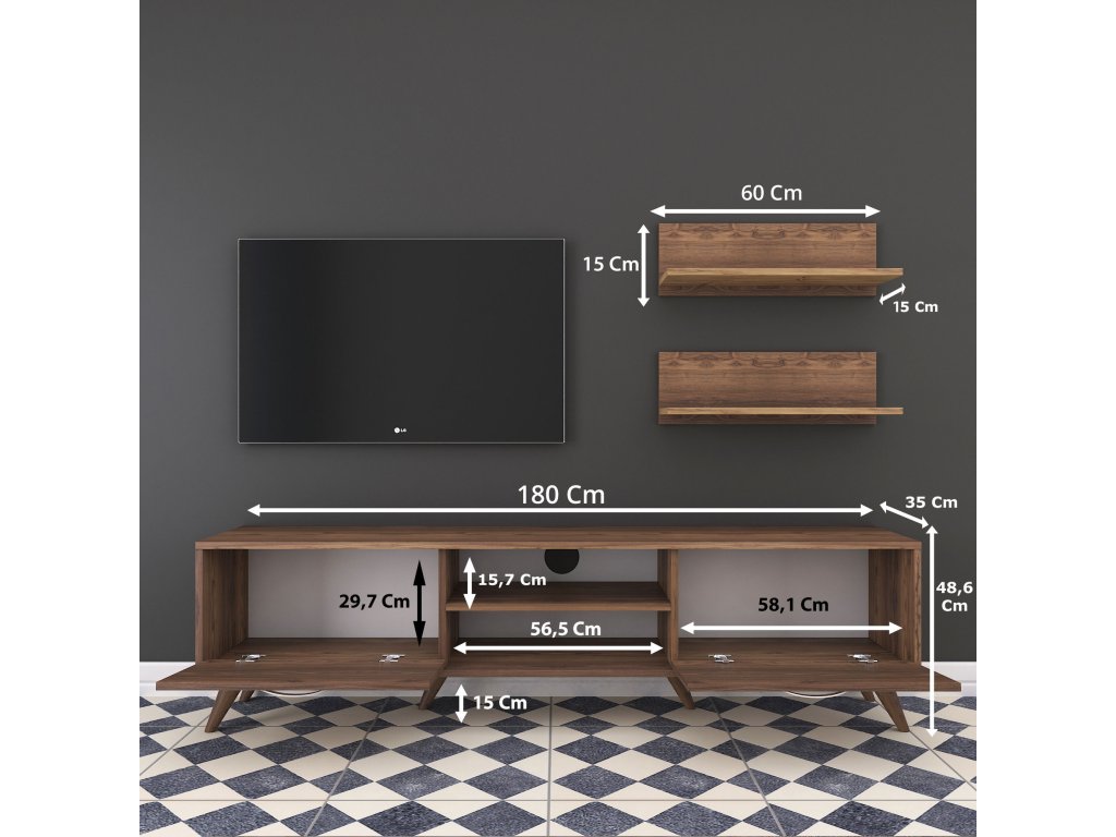 | Sestava obsahuje: | TV stolek 180x35x48,6cm, 2x nástěnná police 60x15x15cm |