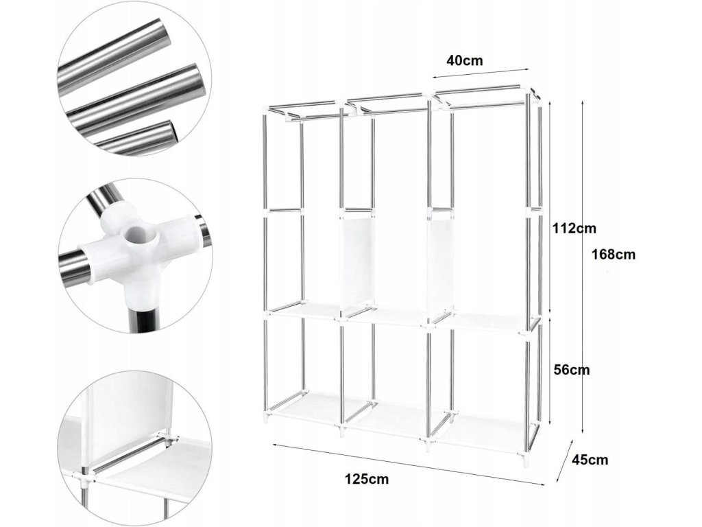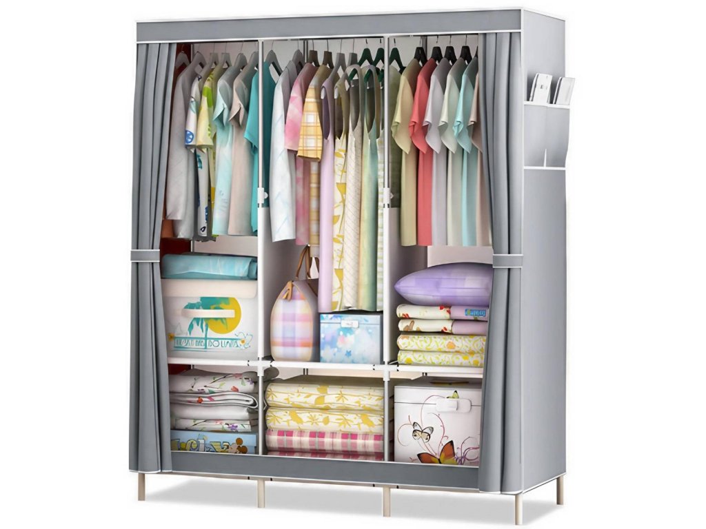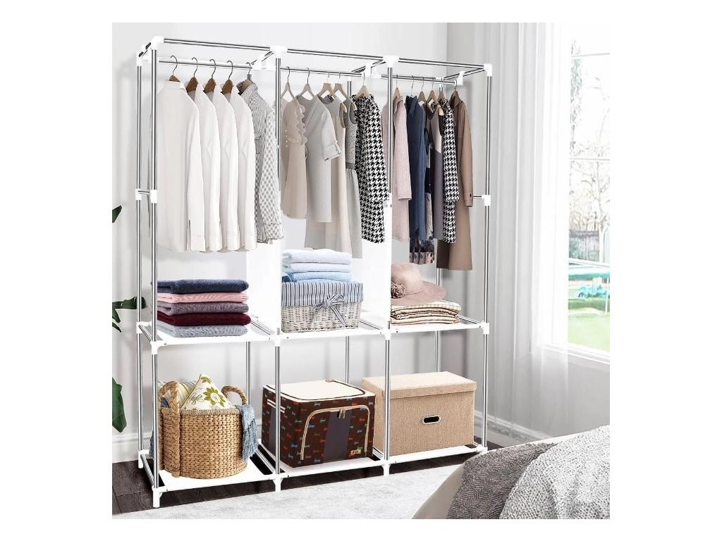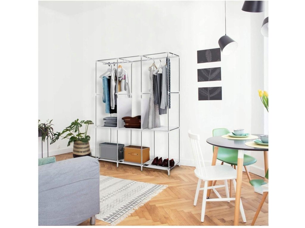 Přenosná skříň je dodávána s jasnými a srozumitelnými pokyny pro montáž, takže ji snadno sestavíte během několika minut bez použití nářadí. Oblečení bude chráněno před prachem a zůstane svěží, čisté a uklizené. Pružná a prodyšná přenosná šatníková skříň poskytuje skvělou ochranu pro vaše oblečení, je vybavena T-zipem a suchým zipem, prachotěsným a voděodolným potahem, který lze snadno čistit vlhkou hadříkem.