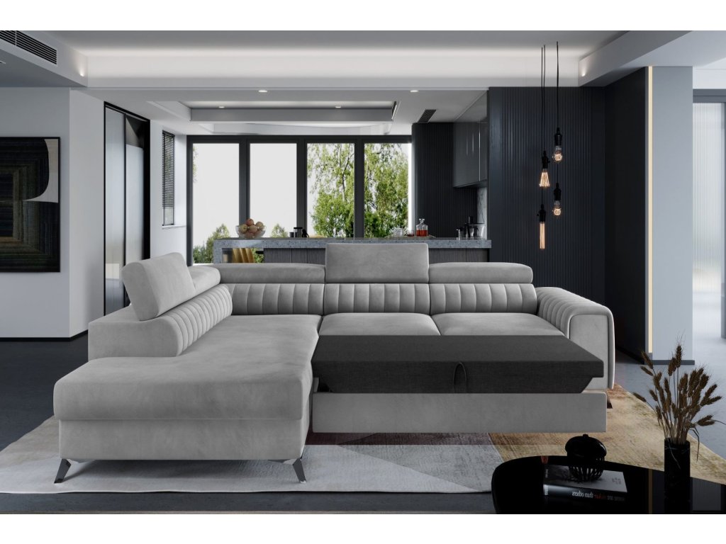 Rozkládací rohová sedací souprava LAURA je vytvořena pro ty, kteří oceňují jak komfort, tak design. Pokud hledáte rohovou sedačku, která je stejně designová i pohodlná, tato sedačka je přesně pro Vás. Elegantní široké područky, stříbrné nožičky a vertikální prošívání na opěradle představují zajímavý dekorativní prvek, který sedačce dodává eleganci a šmrnc.