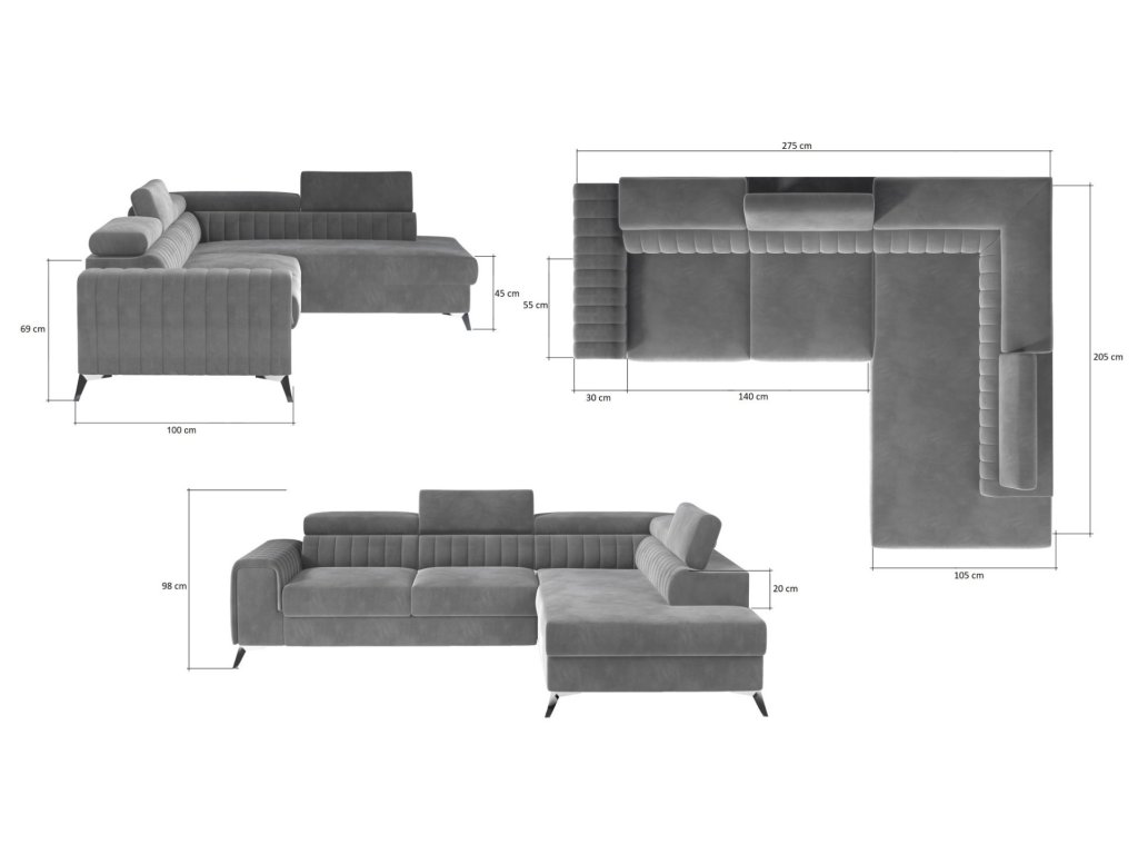 Rozměry sedačky: (š/v/h) 275 x 98 x 205 cm.