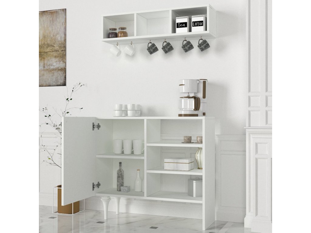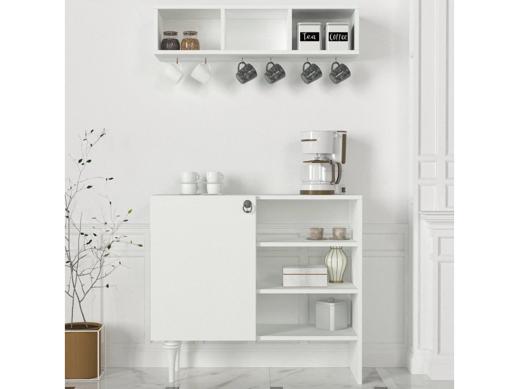 Netradiční stylová kávová skříňka/stolekLAVENA bude svělým doplňkem Vaší kuchyně či jídelny v případě, že jste vlastníkem kávovaru a toužíte po svém kávovém koutku, nebo jen potřebujete vyplnit prostor v kuchyni či jídelně. Nabízí bohatý úložný prostor který jistě oceníte a díky stylovým tvarovaným nožičkám bude ozdobou každé domácnosti. Skvělým bonusem je i velká závěsná police v ceně, která je ideální pro vystavení designových čajových souprav a hrníčků. Tento stylový kousek nábytku Vám budou všichni závidět.