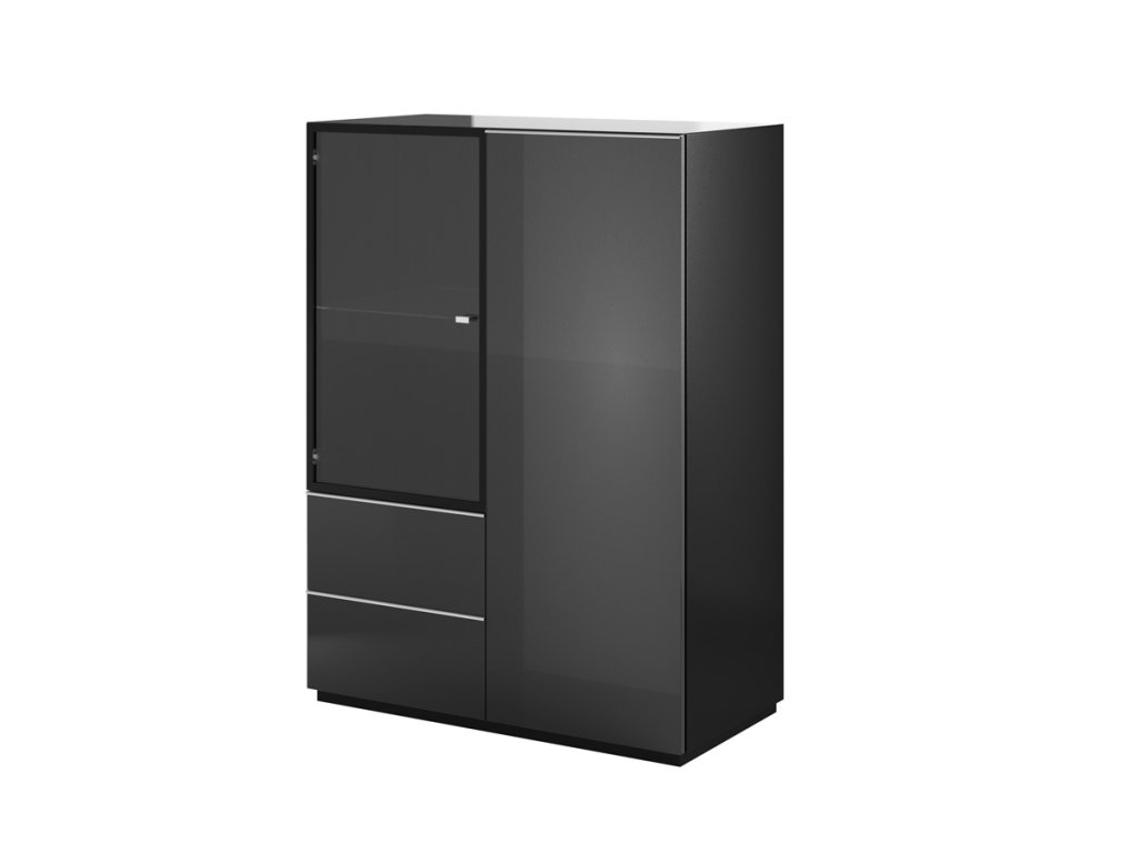 Komoda je dvoudveřová, z toho jedny dvířka jsou prosklená. Ve spodní části se nacházejí dvě praktické zásuvky.