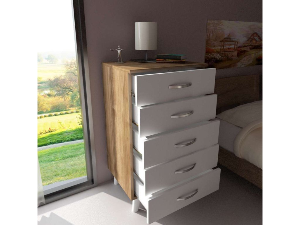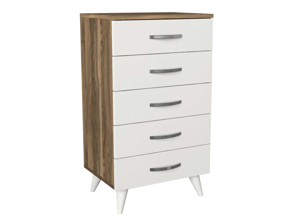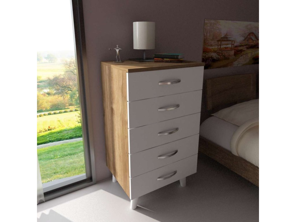 Komoda LEMRE se vyznačuje elegantním kombinací bílé a ořechové barvy, která přináší moderní a přírodní vzhled do vašeho domova. Díky pěti prostorným zásuvkám poskytuje dostatek úložného prostoru pro vaše věci, což vám pomůže udržet váš obývací pokoj nebo ložnici uspořádanou a čistou.