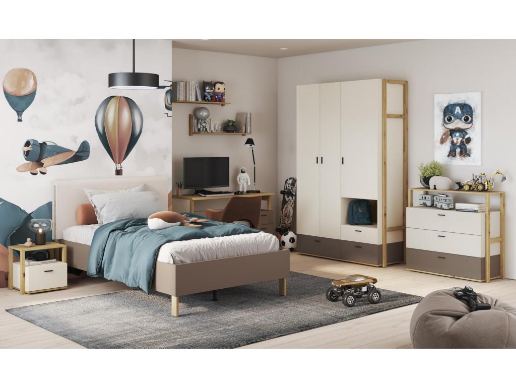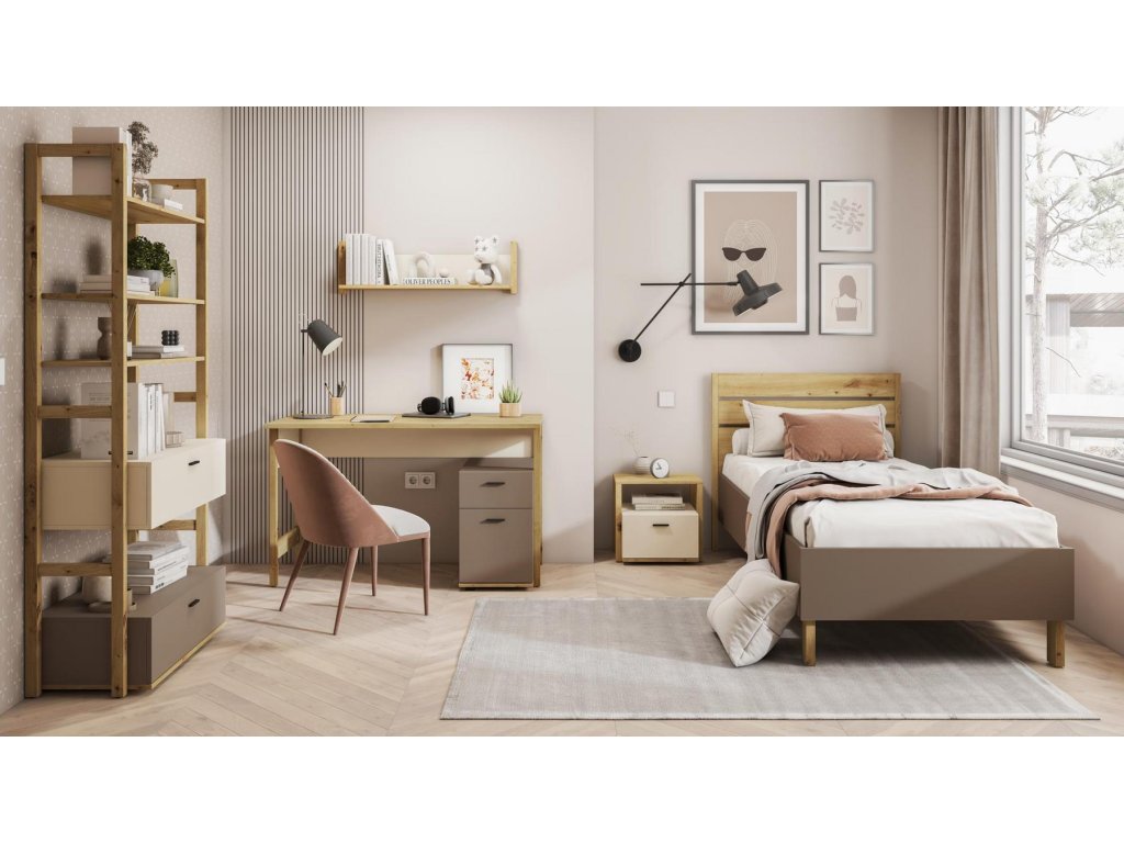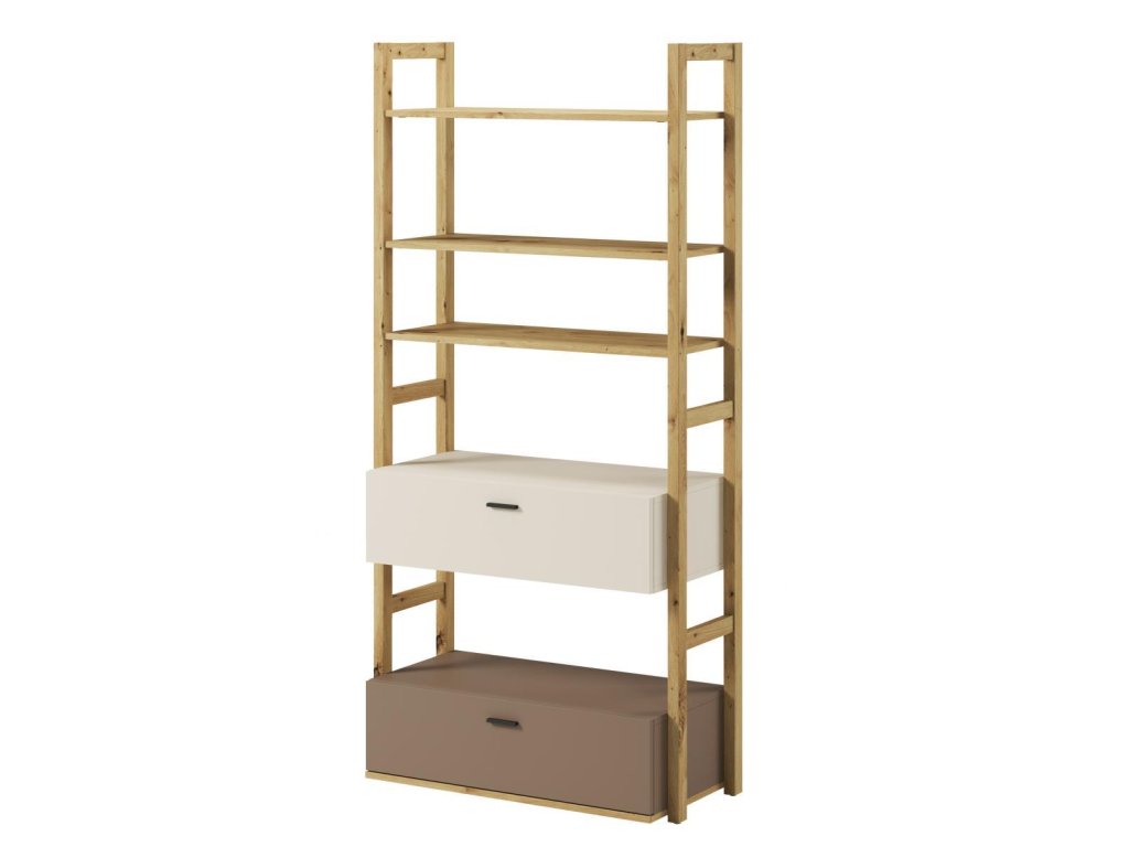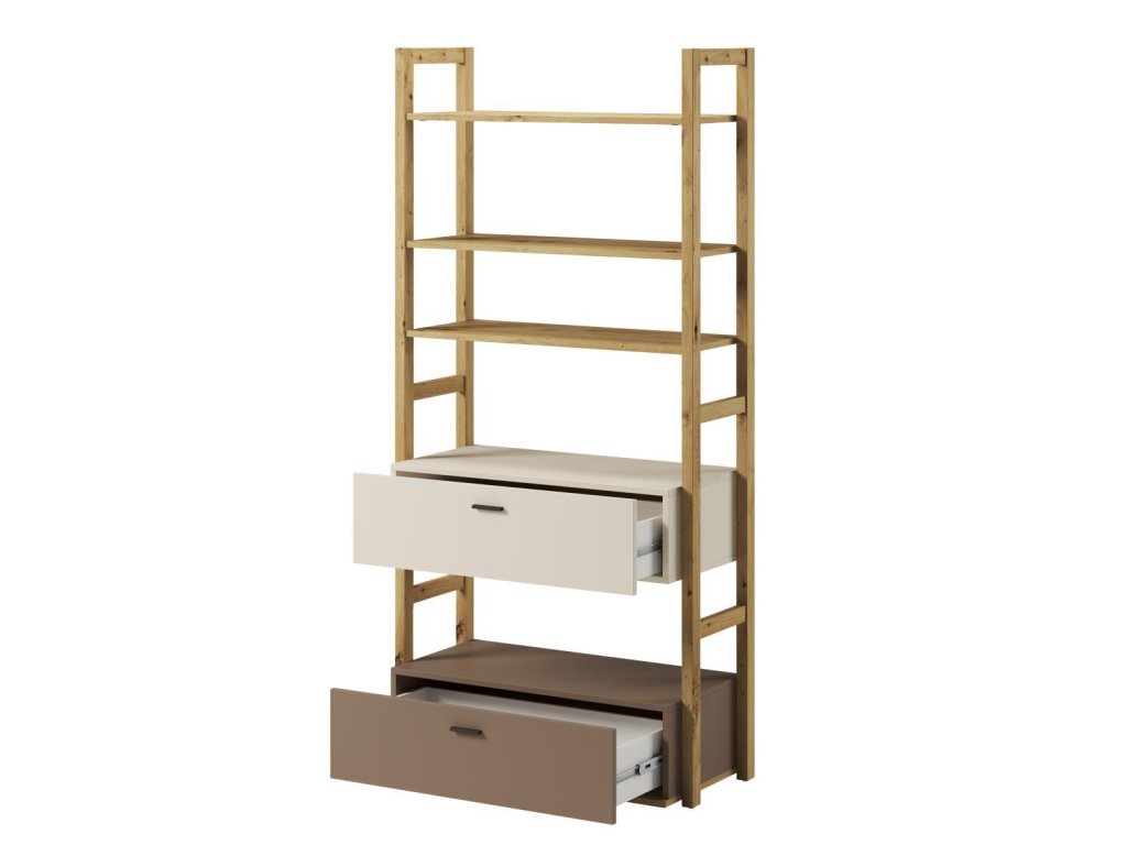 Regál se dvěmi zásuvkami a volným prostorem. Rozměry viz obrázek. Tento sektorový nábytek nejen pro teenagery působí nejen příjemně, ale má i svůj specifický charakter. Je vyroben z kvalitní LTD 16 mm hraněné ABS páskou, zadní strany nábytku a dna zásuvek jsou z HDF 3 mm, ůchyty jsou z plastu. Jemné spojení pískového béžového, lanýžového odstínu a dekoru v barvě dub artisan činí tuto kolekci nejen stylovou, ale také nadčasovou. Dodáváme v demontovaném stavu.