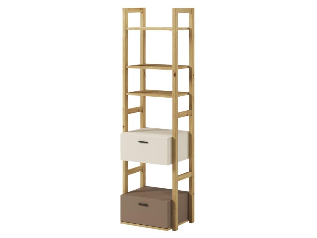 Regál se dvěmi zásuvkami a volným prostorem. Rozměry viz obrázek. Tento sektorový nábytek nejen pro teenagery působí nejen příjemně, ale má i svůj specifický charakter. Je vyroben z kvalitní LTD 16 mm hraněné ABS páskou, zadní strany nábytku a dna zásuvek jsou z HDF 3 mm, ůchyty jsou z plastu. Jemné spojení pískového béžového, lanýžového odstínu a dekoru v barvě dub artisan činí tuto kolekci nejen stylovou, ale také nadčasovou. Dodáváme v demontovaném stavu.