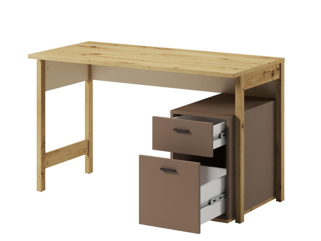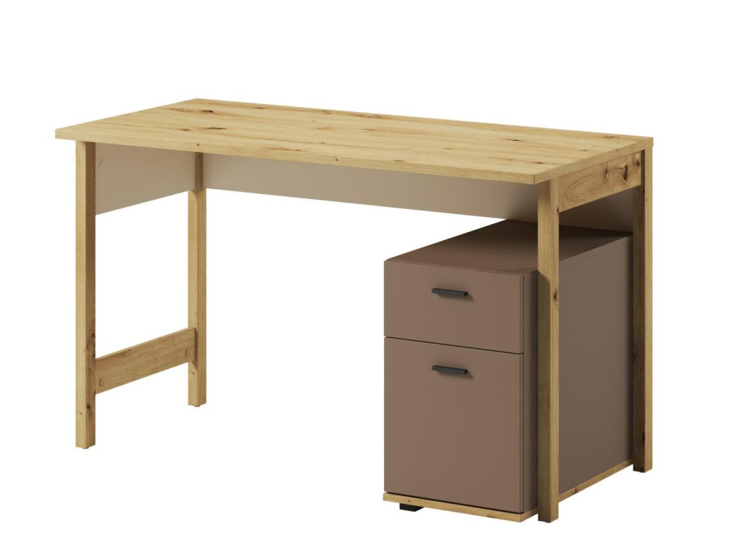 Pracovní stůl se dvěmi zásuvkami a volným prostorem. Rozměry viz obrázek. Tento sektorový nábytek nejen pro teenagery působí nejen příjemně, ale má i svůj specifický charakter. Je vyroben z kvalitní LTD 16 mm hraněné ABS páskou, zadní strany nábytku a dna zásuvek jsou z HDF 3 mm, ůchyty jsou z plastu. Jemné spojení pískového béžového, lanýžového odstínu a dekoru v barvě dub artisan činí tuto kolekci nejen stylovou, ale také nadčasovou. Dodáváme v demontovaném stavu.