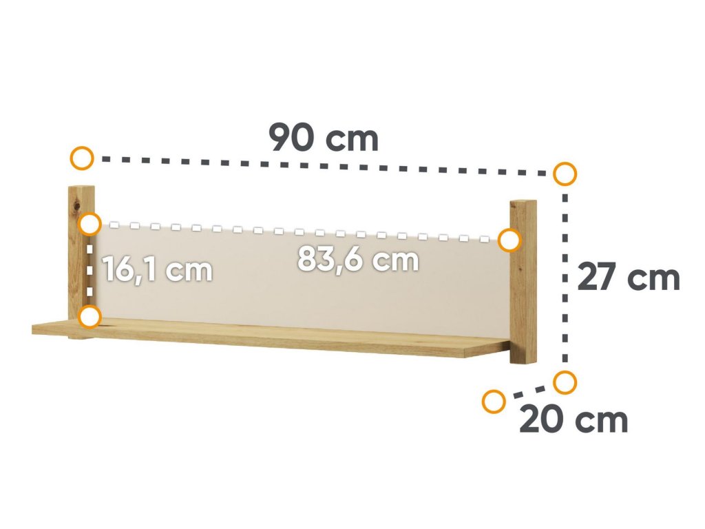 Závěsná police. Rozměry viz obrázek. Tento sektorový nábytek nejen pro teenagery působí nejen příjemně, ale má i svůj specifický charakter. Je vyroben z kvalitní LTD 16 mm hraněné ABS páskou. Jemné spojení pískového béžového a dekoru v barvě dub artisan činí tuto kolekci nejen stylovou, ale také nadčasovou. Dodáváme v demontovaném stavu.