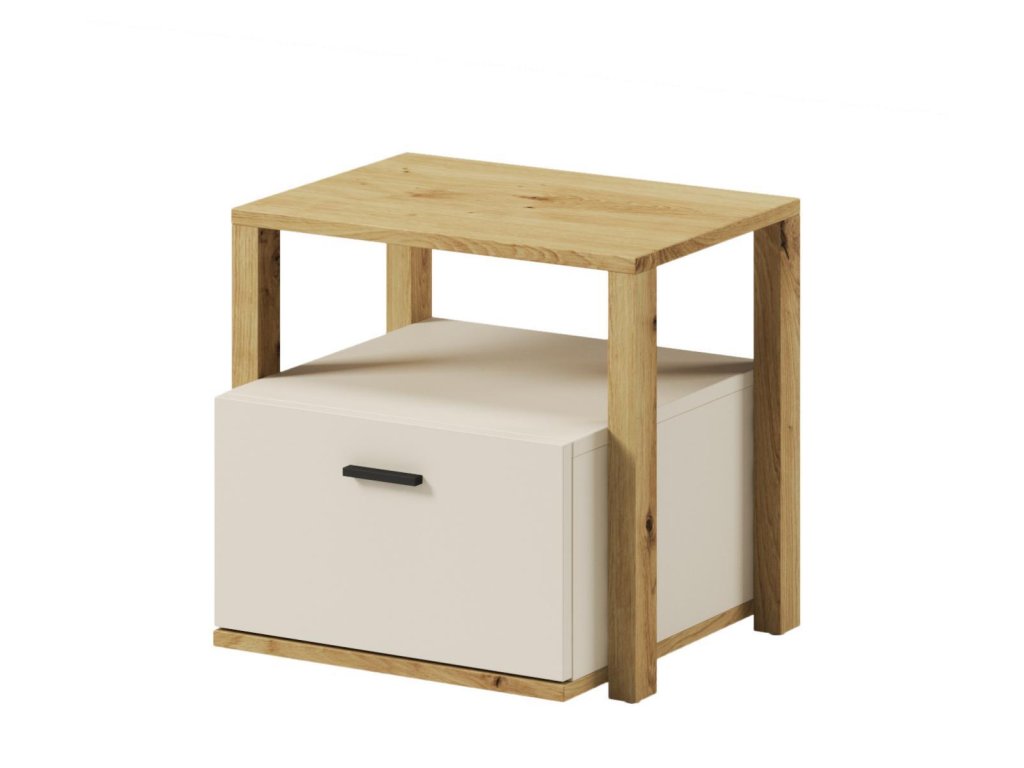 Noční stolek s jednou zásuvkou a volným prostorem. Rozměry viz obrázek. Tento sektorový nábytek nejen pro teenagery působí nejen příjemně, ale má i svůj specifický charakter. Je vyroben z kvalitní LTD 16 mm hraněné ABS páskou, zadní strany nábytku a dna zásuvek jsou z HDF 3 mm, ůchyty jsou z plastu. Jemné spojení pískového béžového a dekoru v barvě dub artisan činí tuto kolekci nejen stylovou, ale také nadčasovou. Dodáváme v demontovaném stavu.