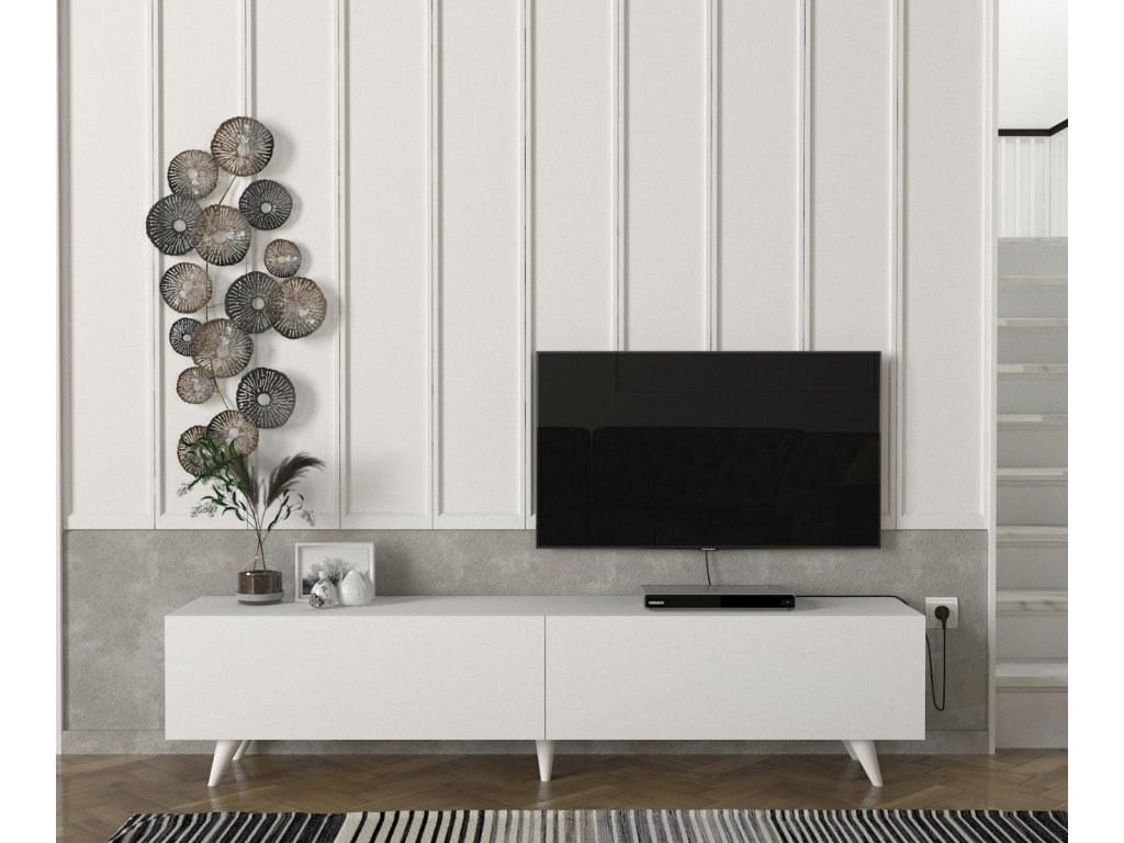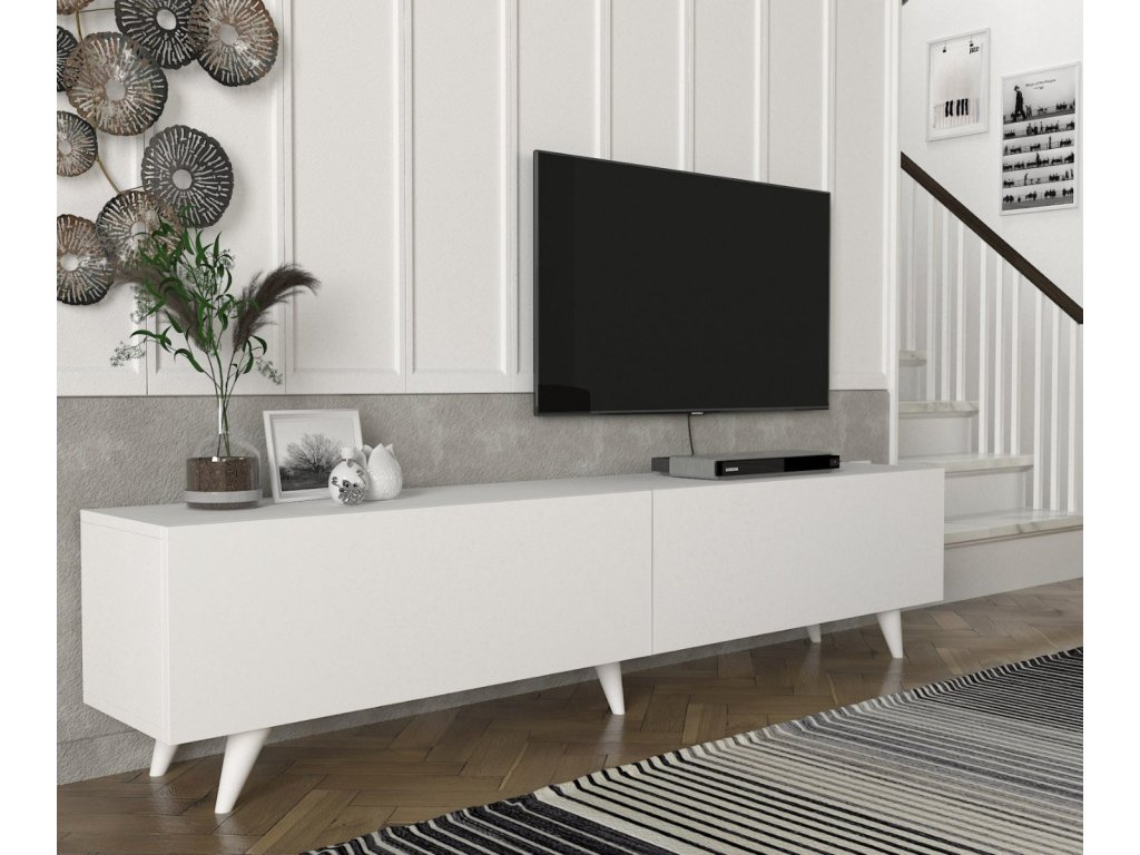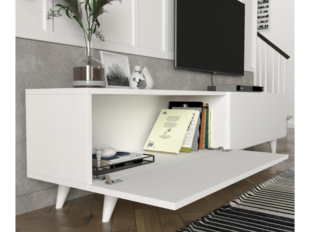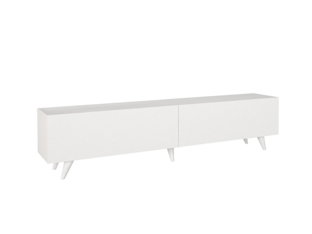 Moderní bílý TV stolek LEYNA se díky svým rozměrům skvěle hodí do malých interiérů. Stolek stojí na trendových bílých nožičkách což produktu dodává na vzdušnosti a moderním designu. Obsahuje praktické výklopné skříňky, do kterých uschováte vše, co potřebujete odložit.