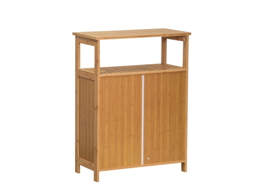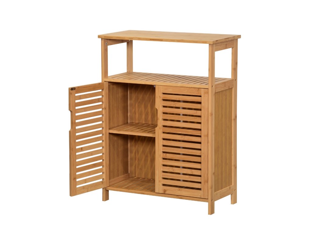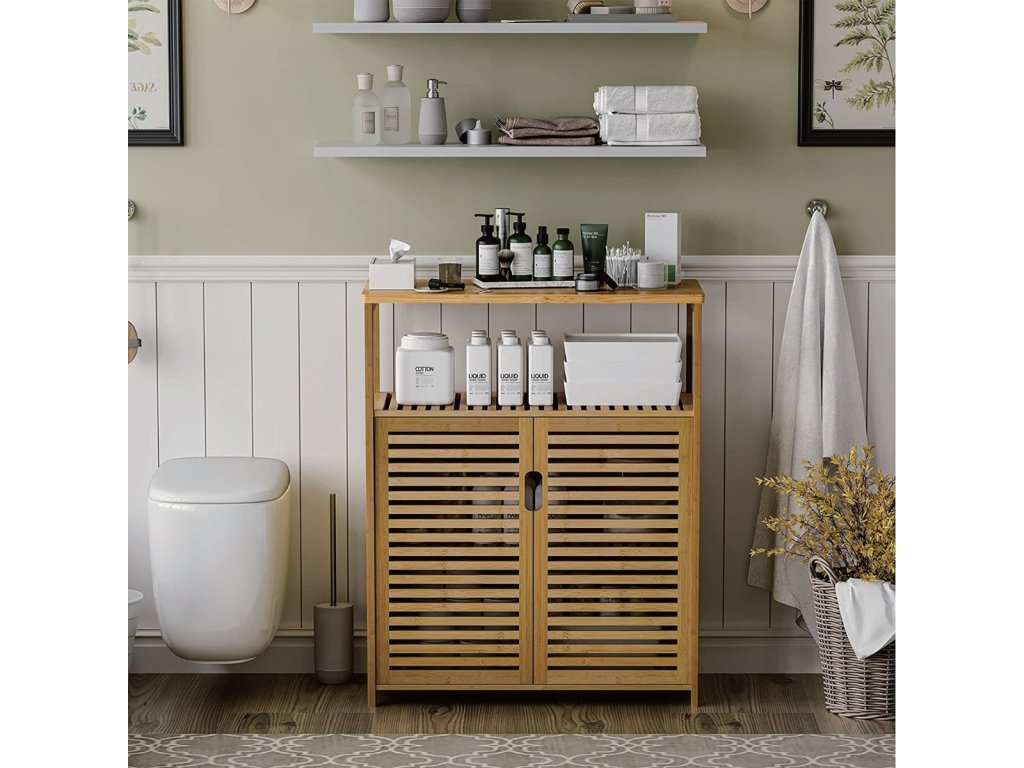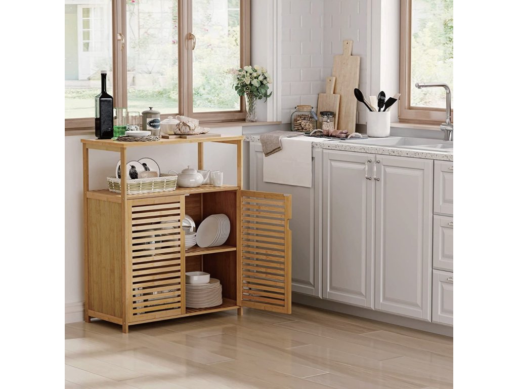 Kromě použití v koupelně může tato praktická volně stojící bambusová skříňka sloužit také jako kuchyňská skříňka pro uložení mikrovlnné trouby, nádobí nebo sklenic; nebo jako příruční stolek v obývacím pokoji pro přehledné uložení knih, deorací a fotografií.