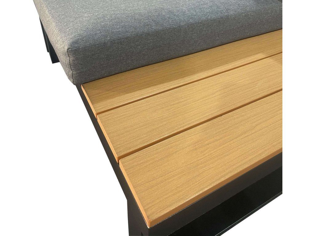 Materiál: polstrování je z nepromokavé látky, hliníková konstrukce, desky z teakového dřeva.