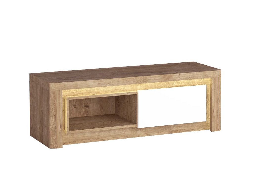 Televizní stolek s LED osvětlením v moderním bezúchytovém provedení. Kolekce nábytku v sobě spojuje jednoduchost, originální vzhled a funkčnost. Nábytek je vyroben z kvalitního lamina ohraničeného ABS páskou, korpus je v barevném provedení dub ribbeck, výklopná dvířka jsou v barvě bílá lesk, doplněno lištou z MDF. Dvířka jsou vybaveny systémem tichého dovírání. Kolekce se skládá z mnoha prvků a tento široký výběr Vám zaručí sestavit si nábytek podle svých vlastních představ a přání. Dodáváme v demontovaném stavu.Doplňkové parametry