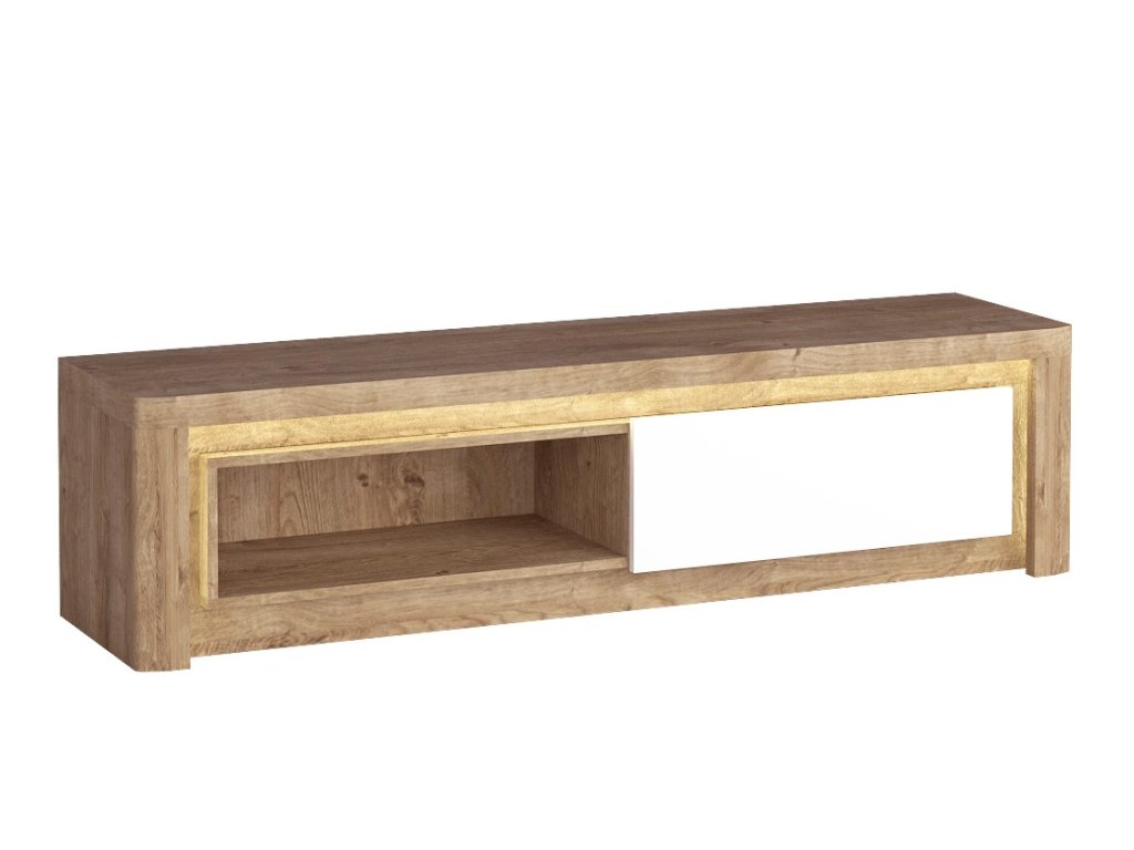 Televizní stolek s LED osvětlením v moderním bezúchytovém provedení. Kolekce nábytku v sobě spojuje jednoduchost, originální vzhled a funkčnost. Nábytek je vyroben z kvalitního lamina ohraničeného ABS páskou, korpus je v barevném provedení dub ribbeck, výklopná dvířka jsou v barvě bílá lesk, doplněno lištou z MDF. Dvířka jsou vybaveny systémem tichého dovírání. Kolekce se skládá z mnoha prvků a tento široký výběr Vám zaručí sestavit si nábytek podle svých vlastních představ a přání. Dodáváme v demontovaném stavu.Doplňkové parametry
