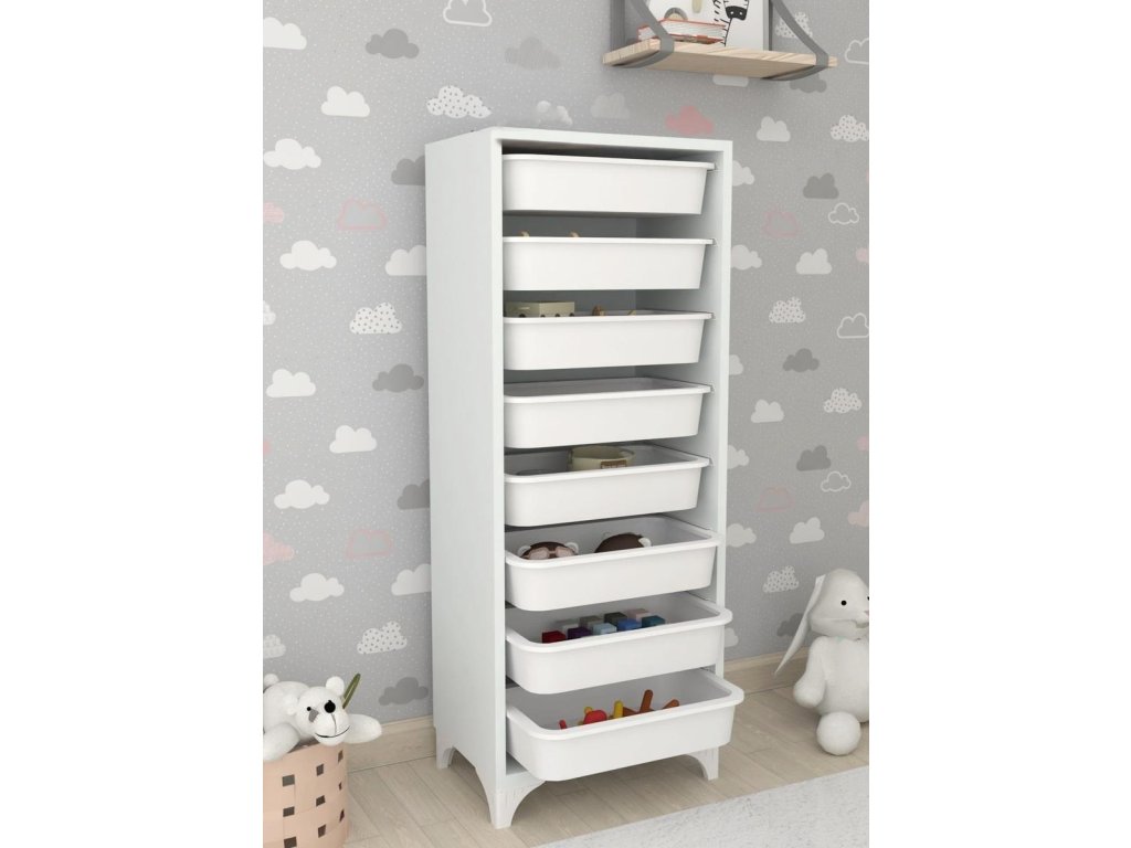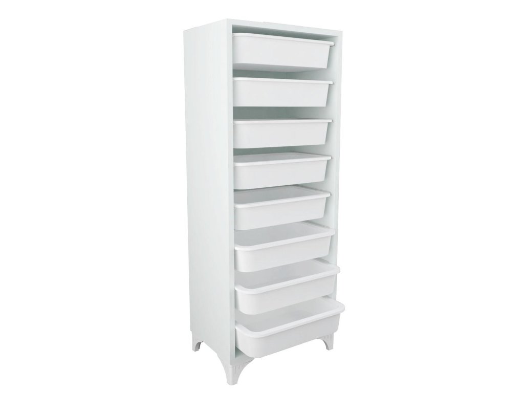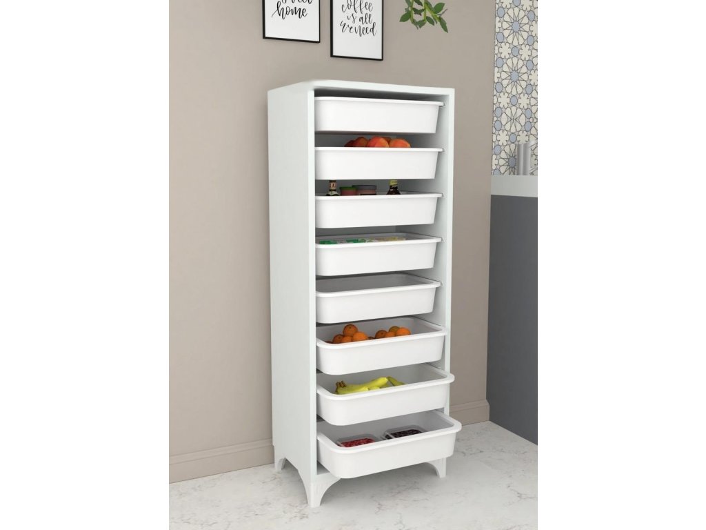 Skříňka je vyrobena z kvalitní LTD desky, která je nenáročná na údržbu. Disponuje osmi samostatnými koši pro uložení ovoce, zeleniny a podobně. Koše a kolejničky jsou vyrobeny z kvalitního PP plastu v bílém barevném provedení.