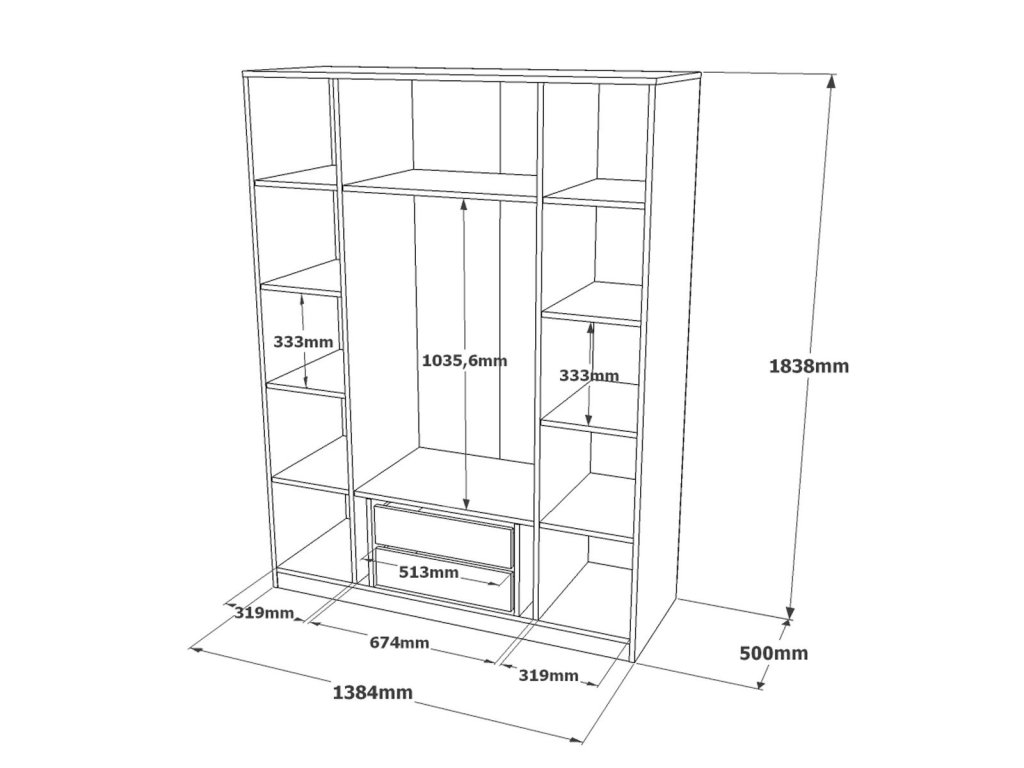 - Vybavení: Zrcadlo, 1 šatní tyč, 2 zásuvky