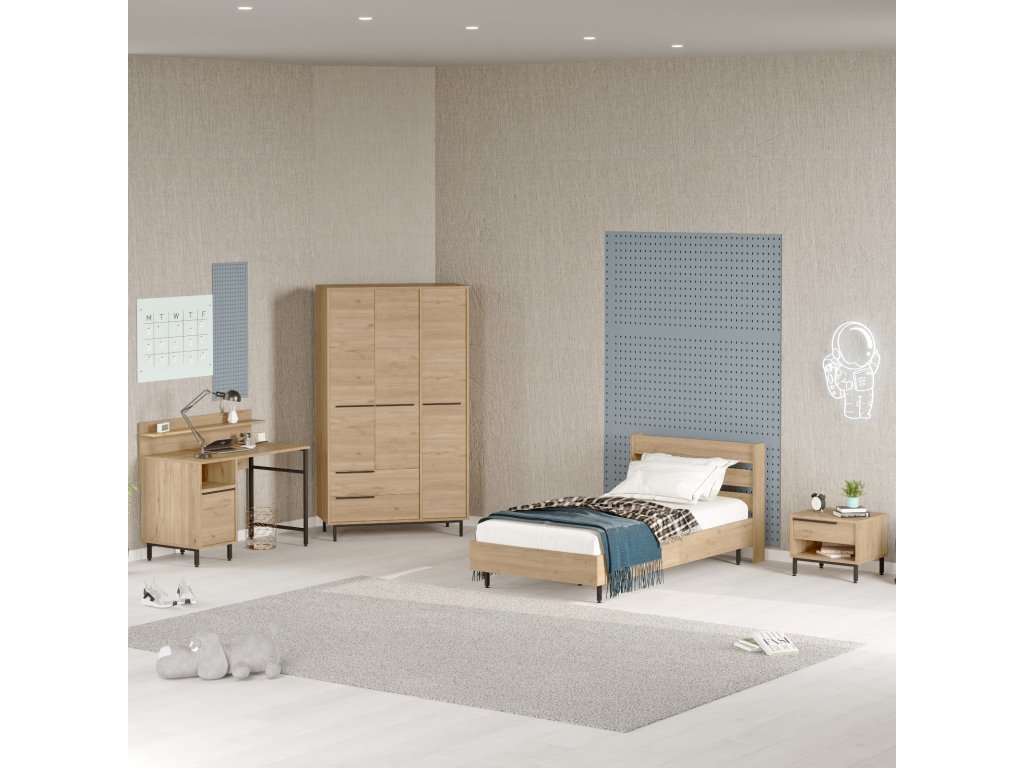 | Sestava obsahuje: | jednolůžková postel 205,6x108,5x86cm, noční stolek 53,6x44,5x42,4cm, šatní skříň 112,2x55x195,6cm, psací stůl 120x60x99,8cm |