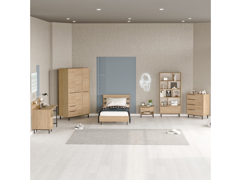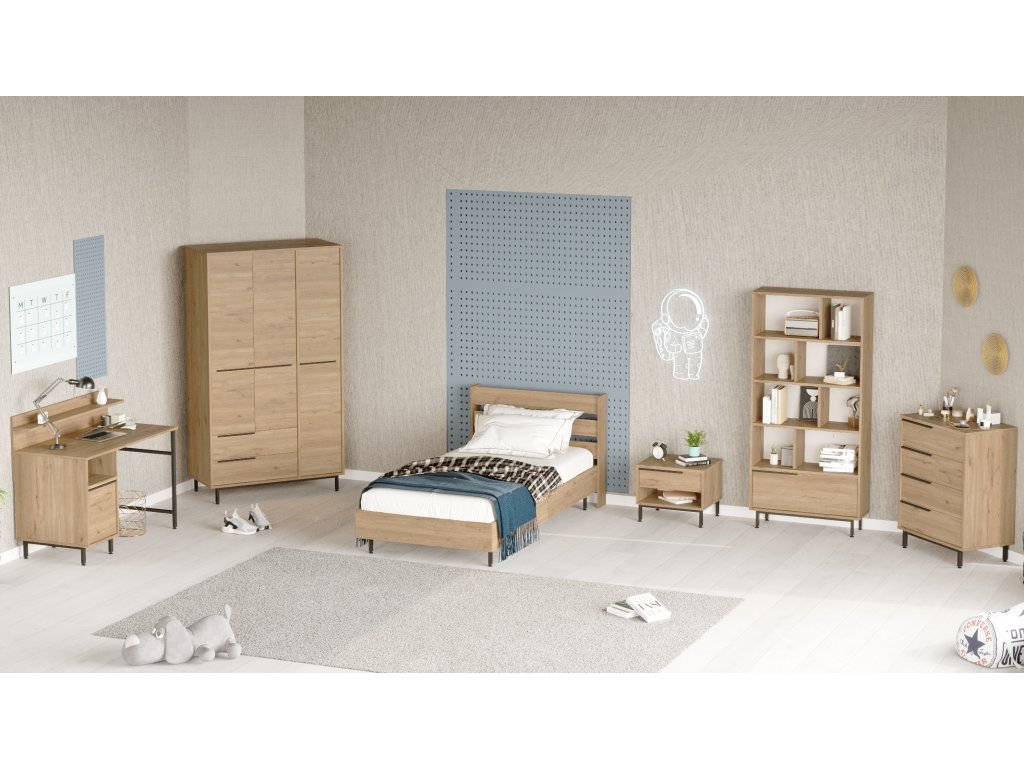 | Sestava obsahuje: | jednolůžková postel 205,6x108,5x86cm, noční stolek 53,6x44,5x42,4cm, šatní skříň 112,2x55x195,6cm, psací stůl 120x60x99,8cm, knihovna 83,9x29,5x175,6cm, komoda 74,8x44,5x95,1cm |