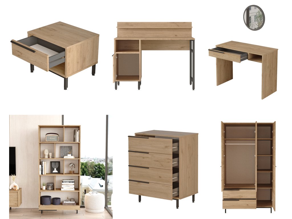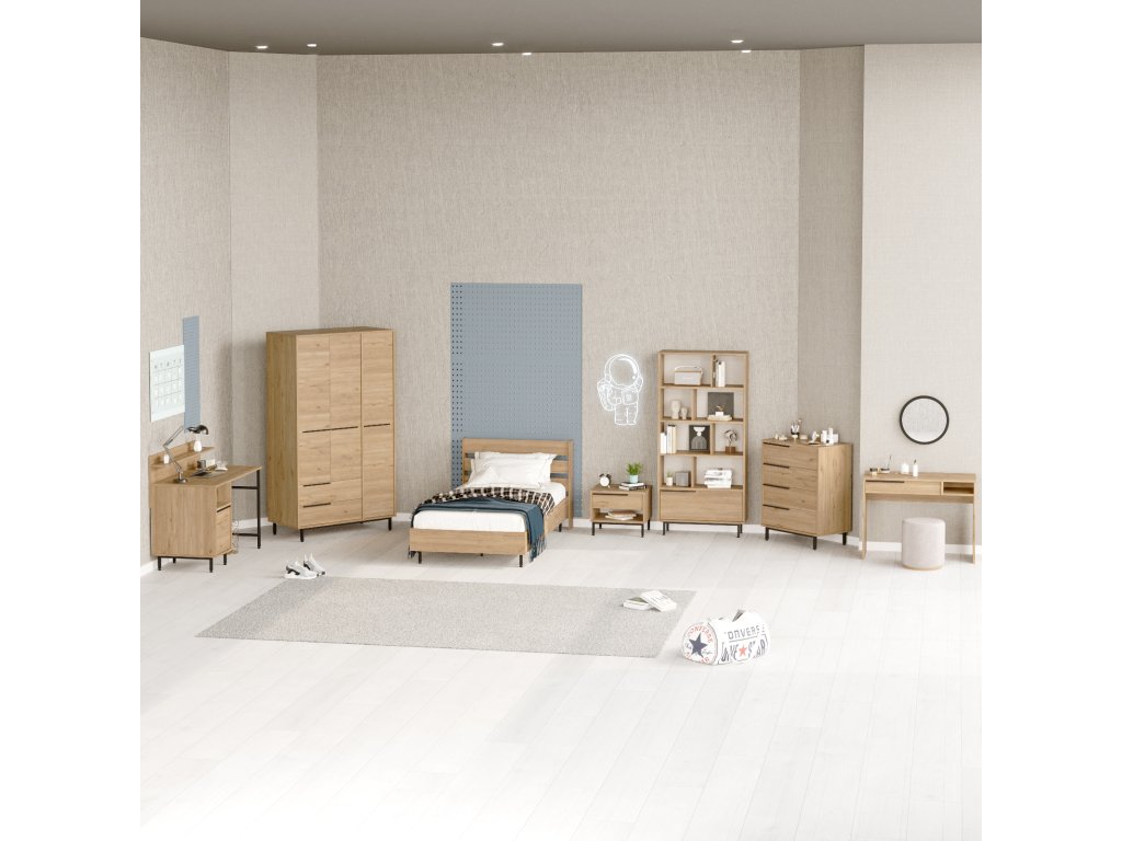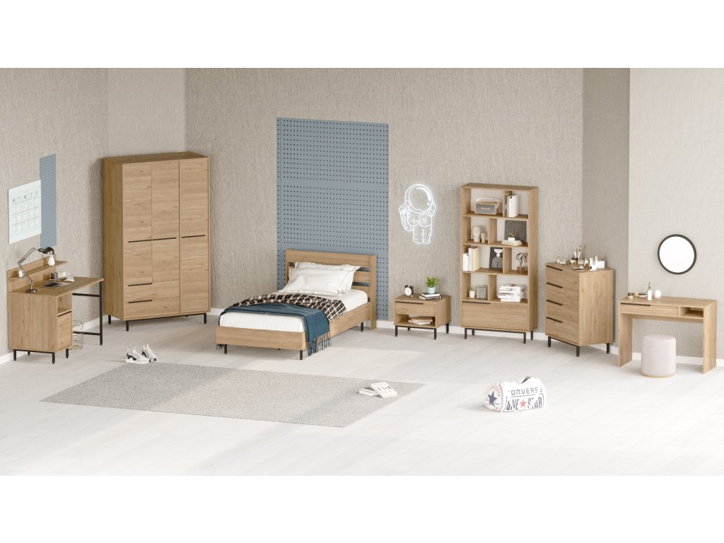 | Sestava obsahuje: | jednolůžková postel 205,6x108,5x86cm, noční stolek 53,6x44,5x42,4cm, šatní skříň 112,2x55x195,6cm, psací stůl 120x60x99,8cm, knihovna 83,9x29,5x175,6cm, komoda 74,8x44,5x95,1cm, toaletní stolek 100x44,5x75cm |