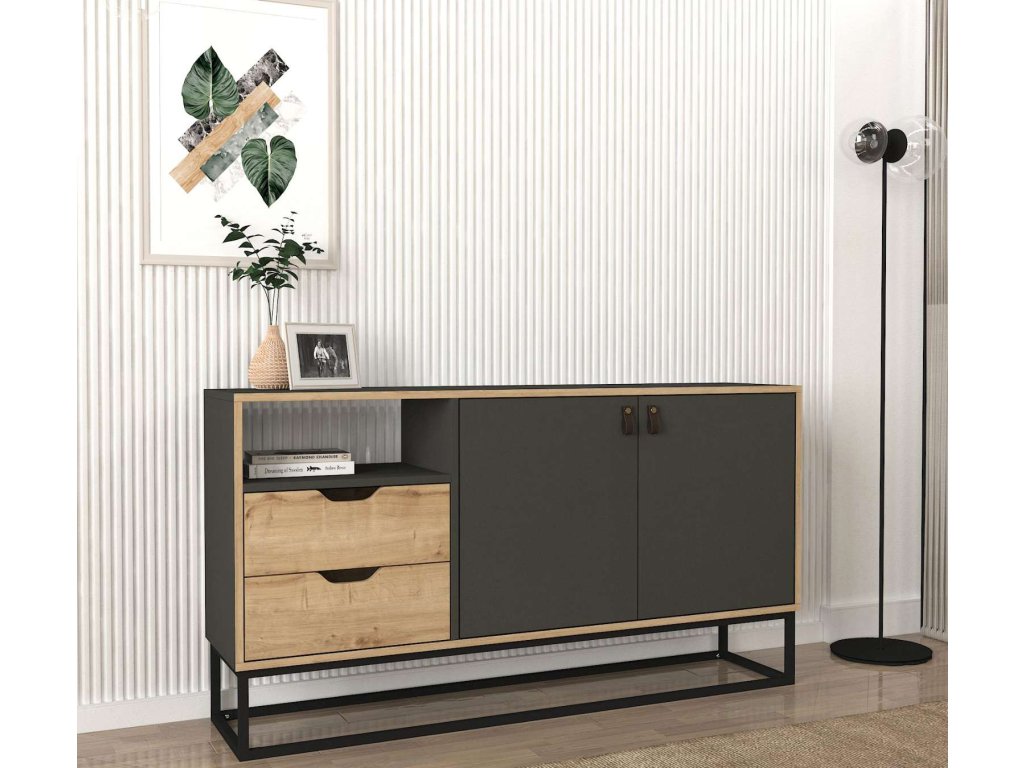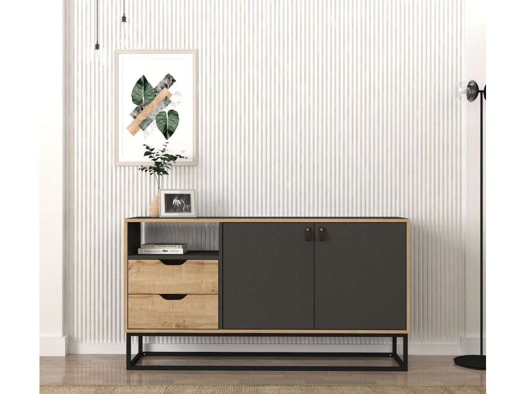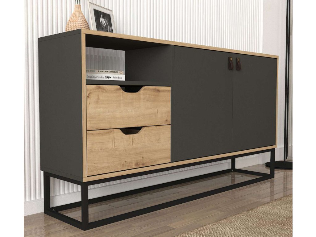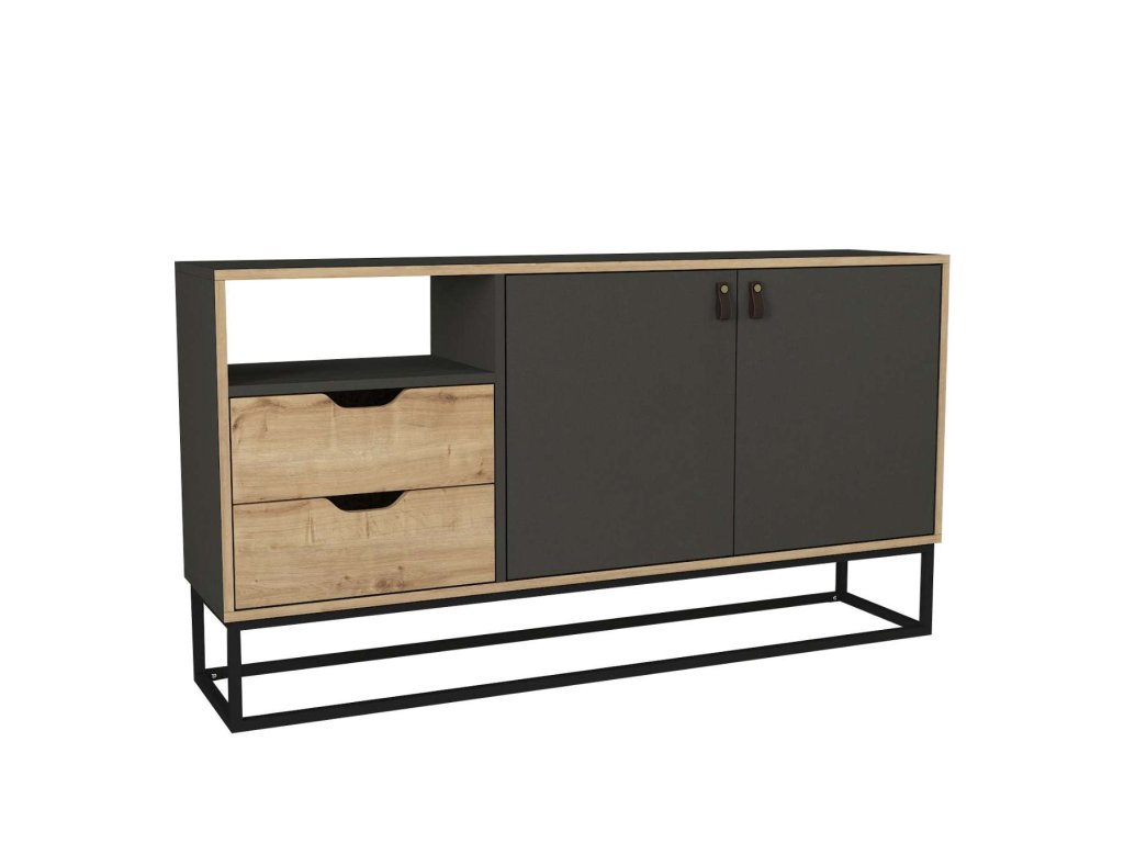 Komoda LORES je vyrobena z kvalitního LTD materiálu a kovu s tloušťkou 18 mm, což zajišťuje její pevnost a dlouhou životnost. Elegantní kombinace antracitové a světle hnědé barvy dodává komodě moderní a sofistikovaný vzhled, který se hodí do jakéhokoliv interiéru. Komoda je vybavena dvěma dvířky a dvěma zásuvkami, které poskytují dostatek úložného prostoru pro vaše potřeby.