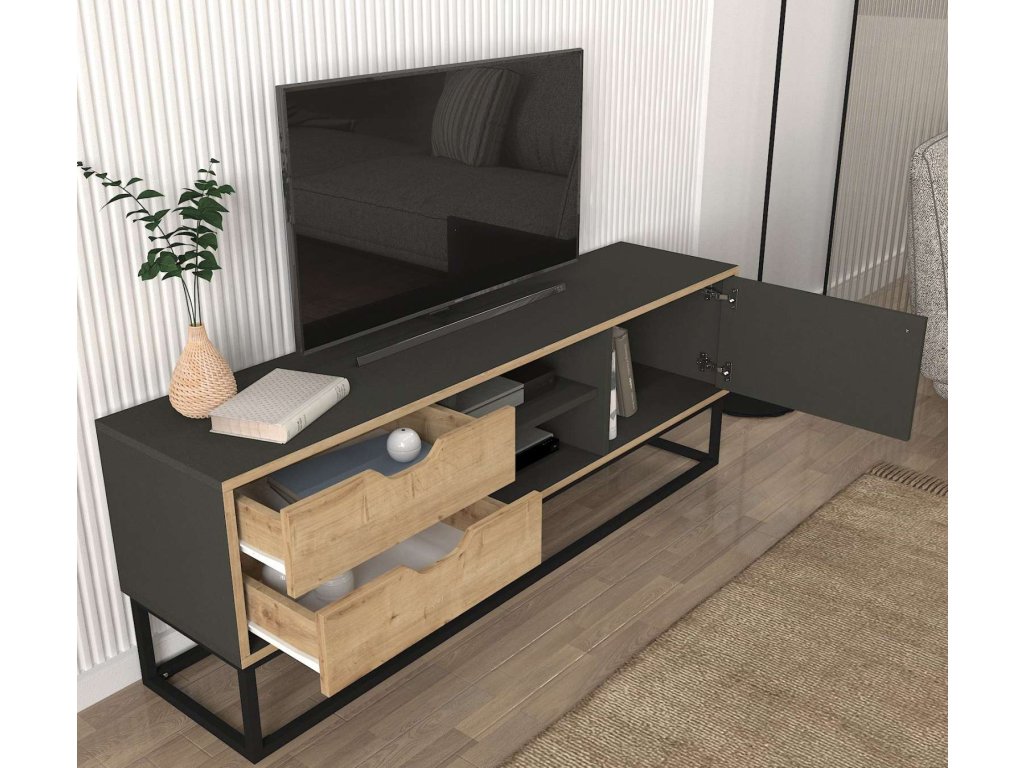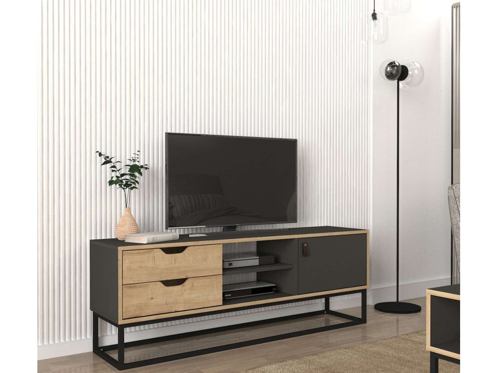 Seznamte se s LORES, TV stolkem, který kombinuje funkčnost s moderním designem, ideální pro každý obývací pokoj. Jeho elegantní světle hnědá a antracitová barva společně s praktickým designem poskytují nejen úložný prostor, ale také dotvářejí stylový vzhled vašeho domova.