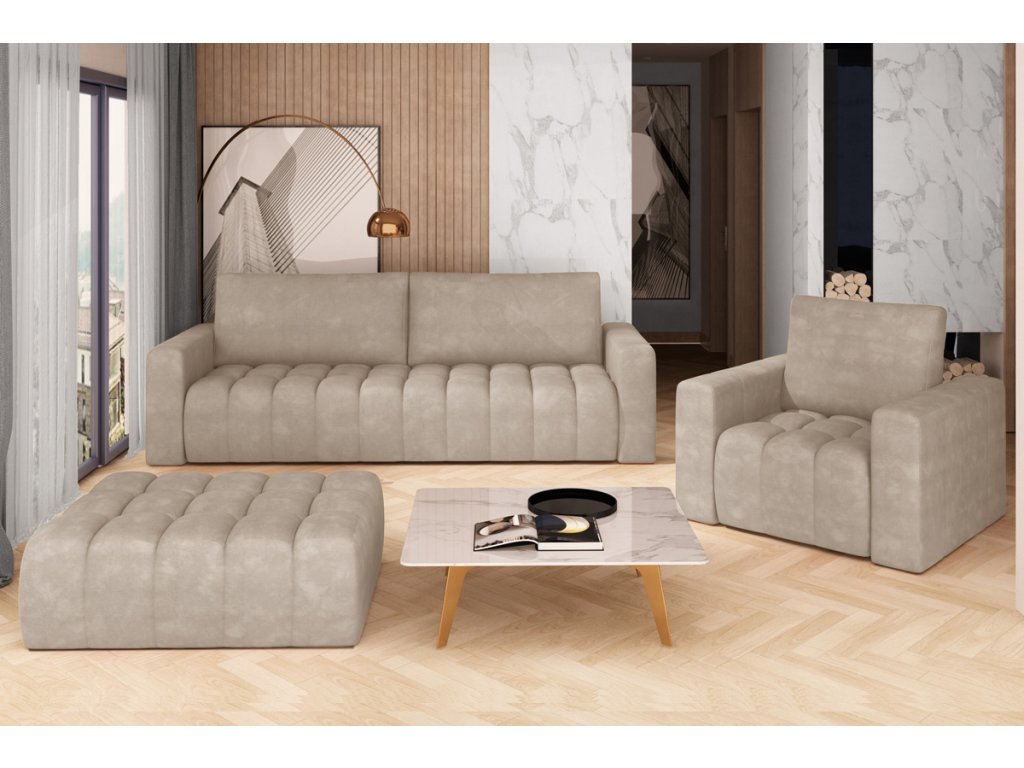 Sedací souprava LOSIKA vás zaujme svou elegancí a stylovým provedením. Tato moderní sestava se skládá ze tří atraktivních prvků, kterými jsou: pohovka, křeslo a taburetka.
