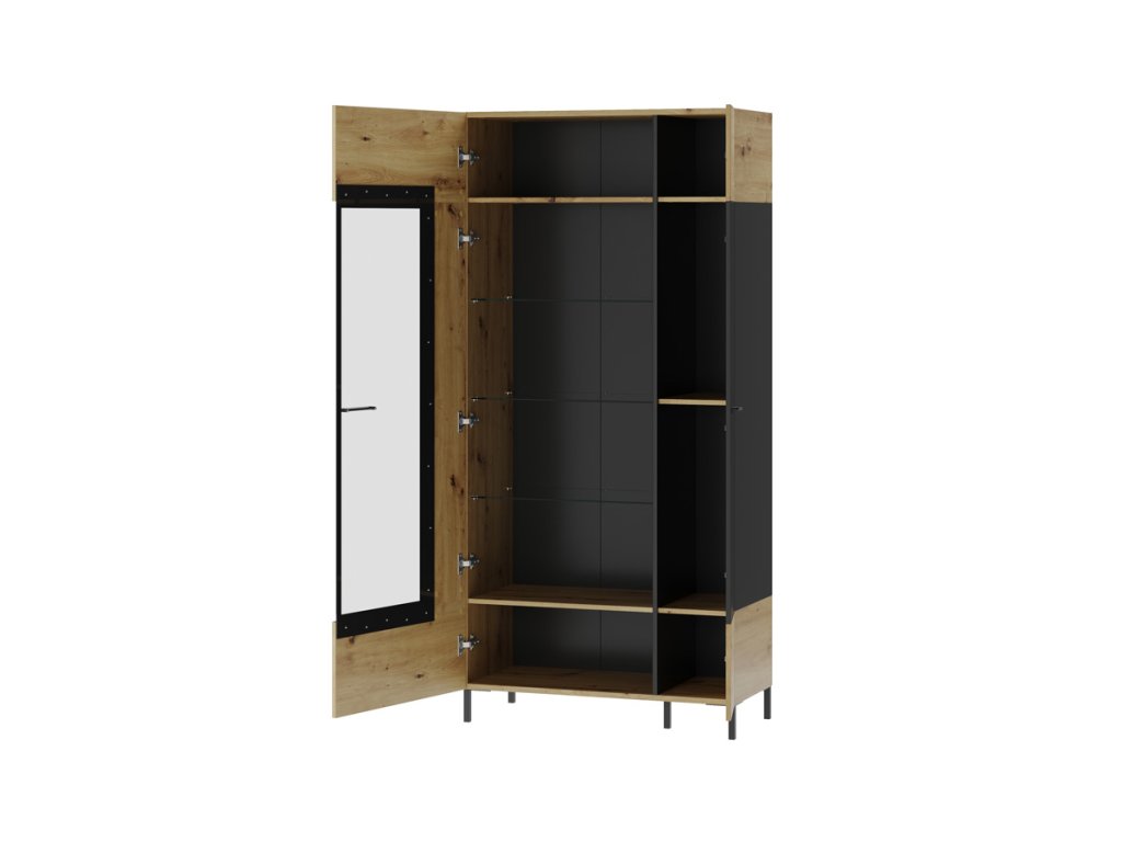 Vitrína je dvoudveřová, prosklená. Otevírá se do pravé strany. Uvnitř se nachází 8 praktických polic, z toho 3 jsou prosklené. LED osvětlení není v ceně. Lze si jej dokoupit.