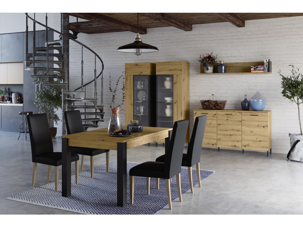 Je vyrobena z kvalitních LTD desek, které jsou nenáročné na údržbu . Stylové úchyty jsou v tmavém provedení. Vyrobeny jsou z plastu. Moderní nožičky jsou vyrobeny z kovu. Její barevné provedení je ve spojení barev dub artisan, černá matná.