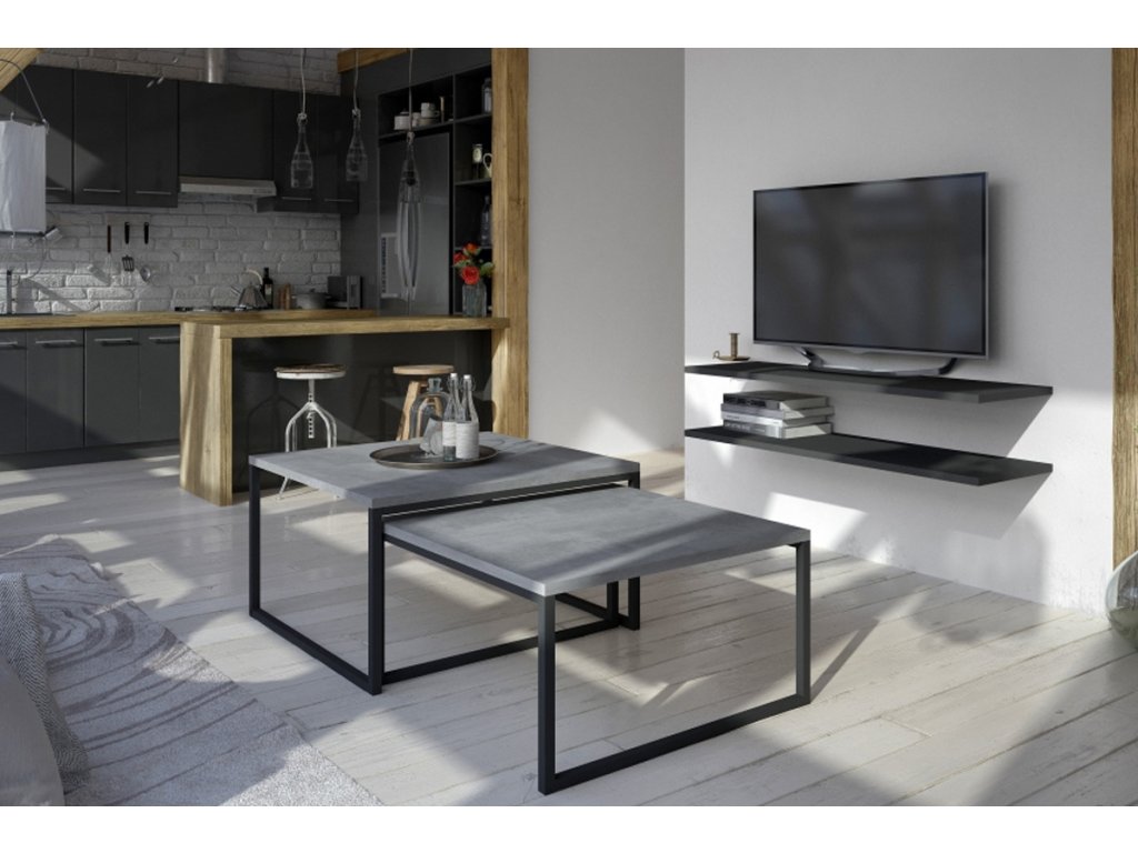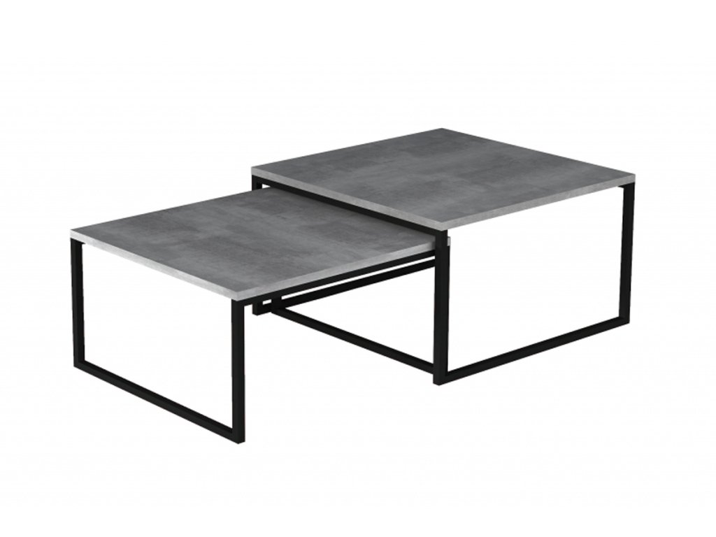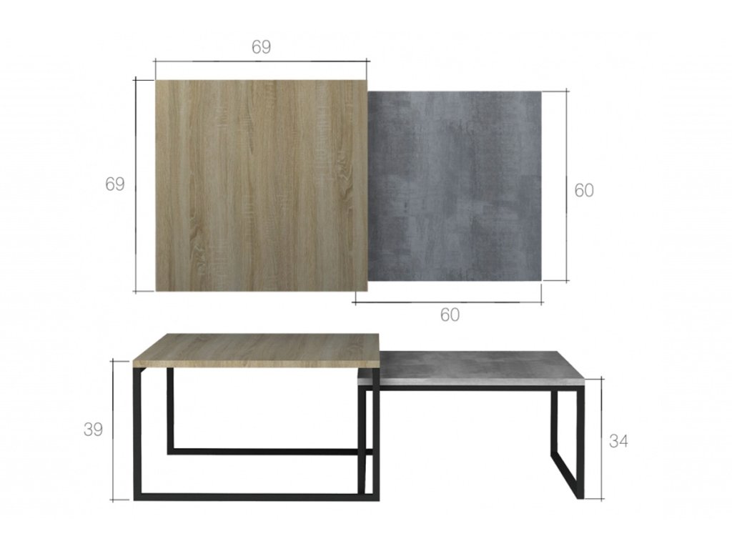 Konstrukce stolku je vyrobena z kovu, v barevném provedení černá. Deska je z kvalitní LTD desky, v módním odstínu beton. Tloušťka desky je 1,8 cm. Rozměr většího stolku (š/v/h): 69 x 39 x 69 cm. Rozměr menšího stolku (š/v/h): 60 x 34 x 60 cm.