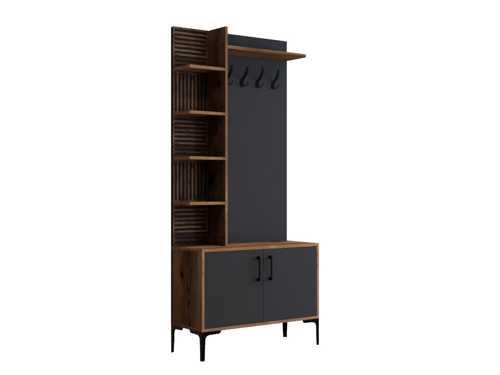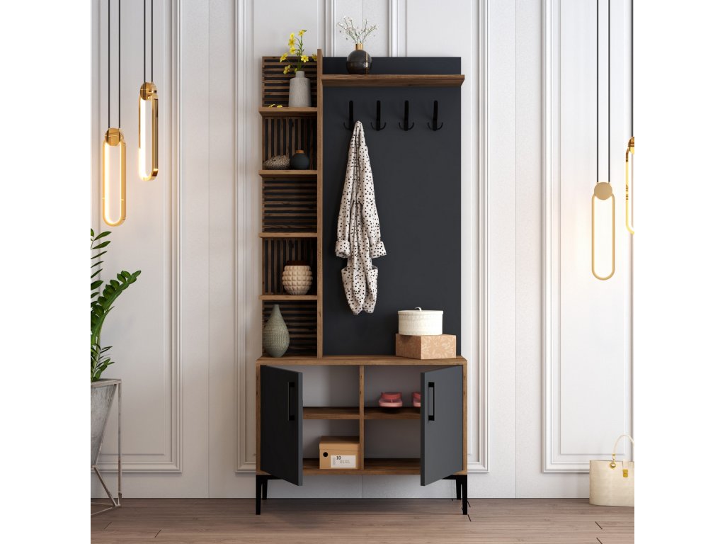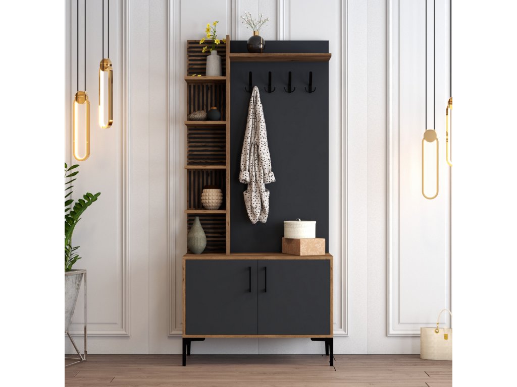 Kontrastní barvy ořechu a antracit vytvářejí vizuálně přitažlivý vzhled, který vylepší jakoukoli chodbu. Elegantní a moderní design tohoto předsíňového stojánku okamžitě pozvedne styl vašeho prostoru a stane se ústředním bodem, který zapůsobí na vaše hosty.