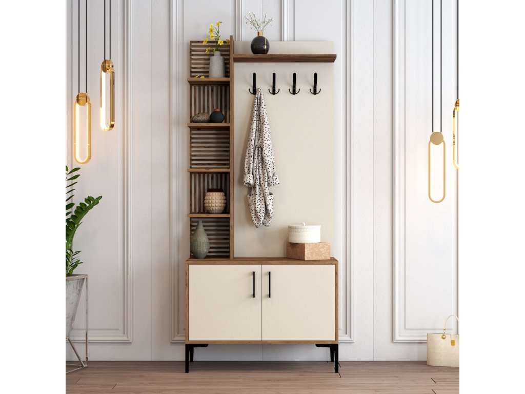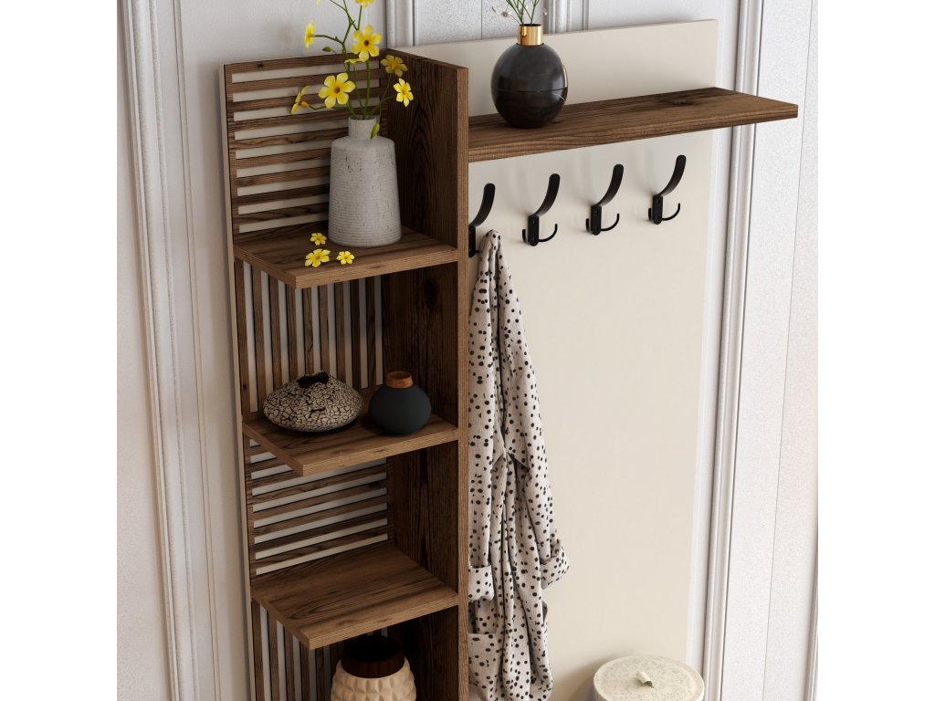 Díky industriálně inspirovanému designu dodává náš stojánek do předsíně každému prostoru nádech moderní elegance. Kombinace ořechové a krémové barvy vytváří výrazný kontrast, který okamžitě upoutá pozornost vašich hostů.