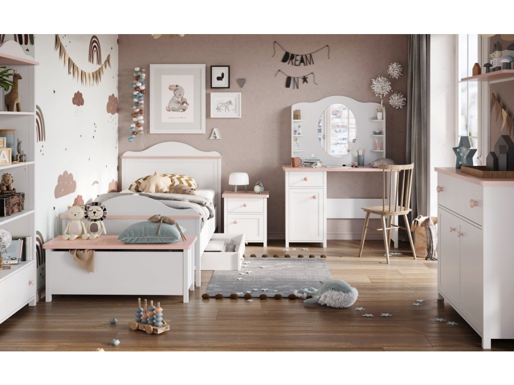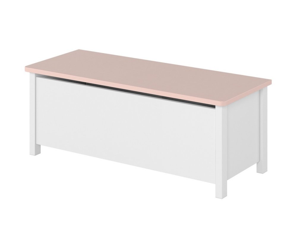 Komoda s výklopným víkem. Tento elegantní nábytek dodá romantickou atmosféru pokojíčku malé princezny i větší slečny. Komoda je vyrobena z desky LTD v barvě bílé s doplňkovou barvou růžovou. Komodu je možné využít jako úložný prostor pro lůžkoviny nebo hračky, pokud na komodu umístíte polstrování - může sloužit jako sedací lavice. Dodáváme v demontovaném stavu.Doplňkové parametry