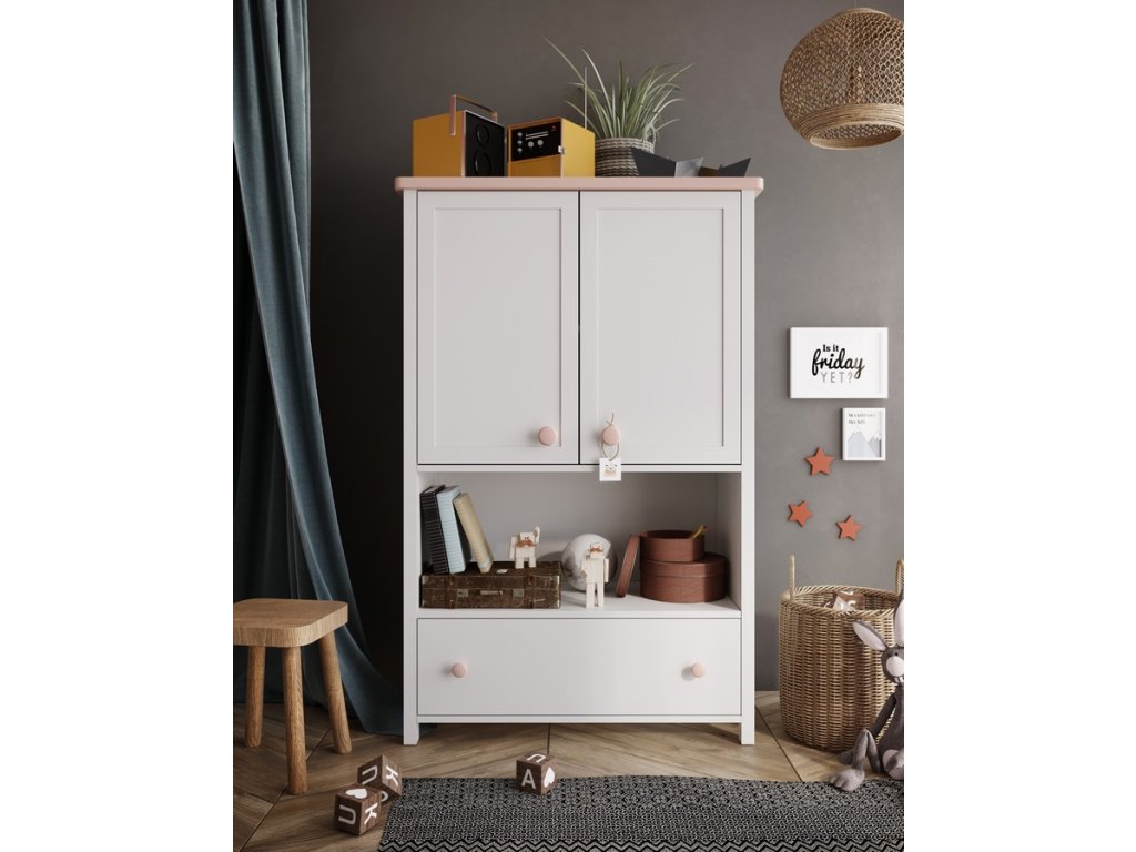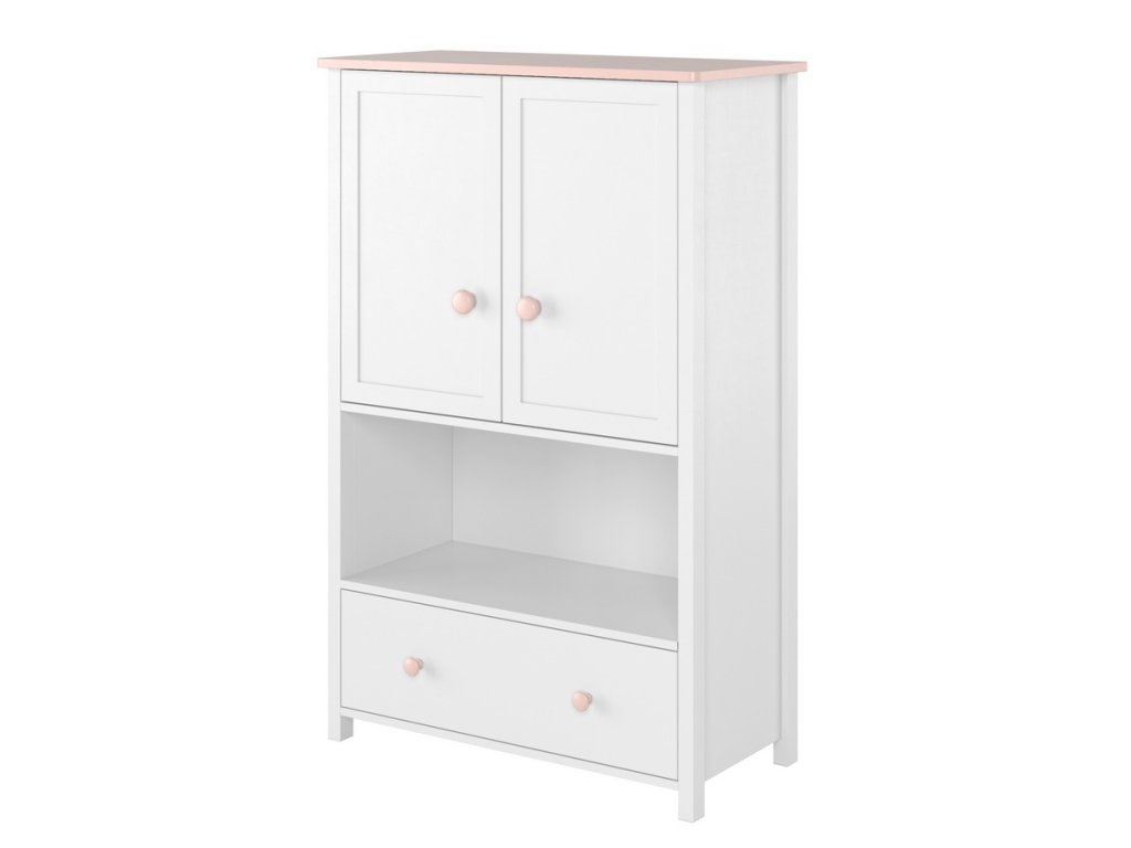 Dvoudveřová komoda se zásuvkou. Tento elegantní nábytek dodá romantickou atmosféru pokojíčku malé princezny i větší slečny. Komoda je vyrobena z desky LTD v barvě bílé s doplňkovou barvou růžovou. Komoda má v horní části dvířka a ve spodní části zásuvku. Úchyty jsou plastové v růžové barvě. Dodáváme v demontovaném stavu.Doplňkové parametry