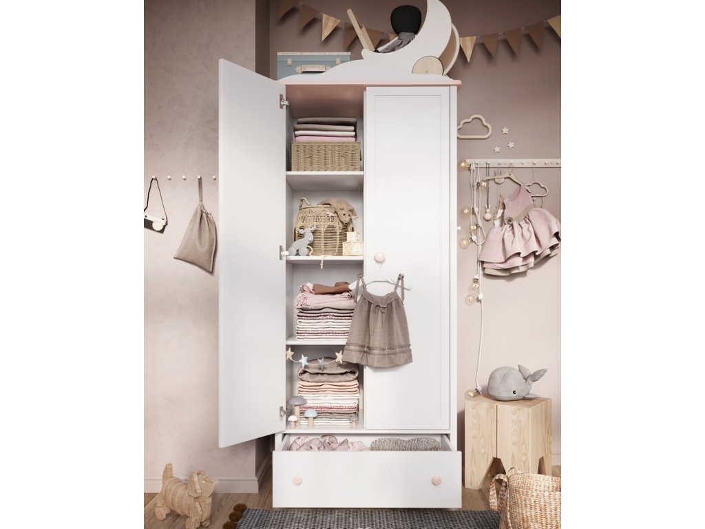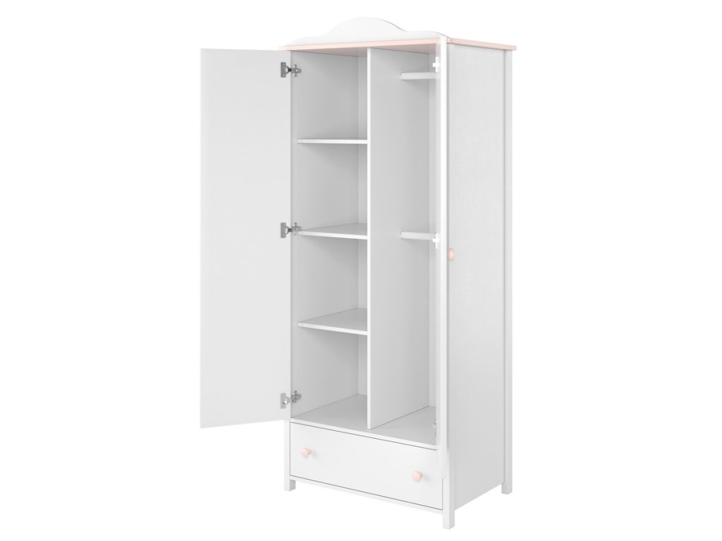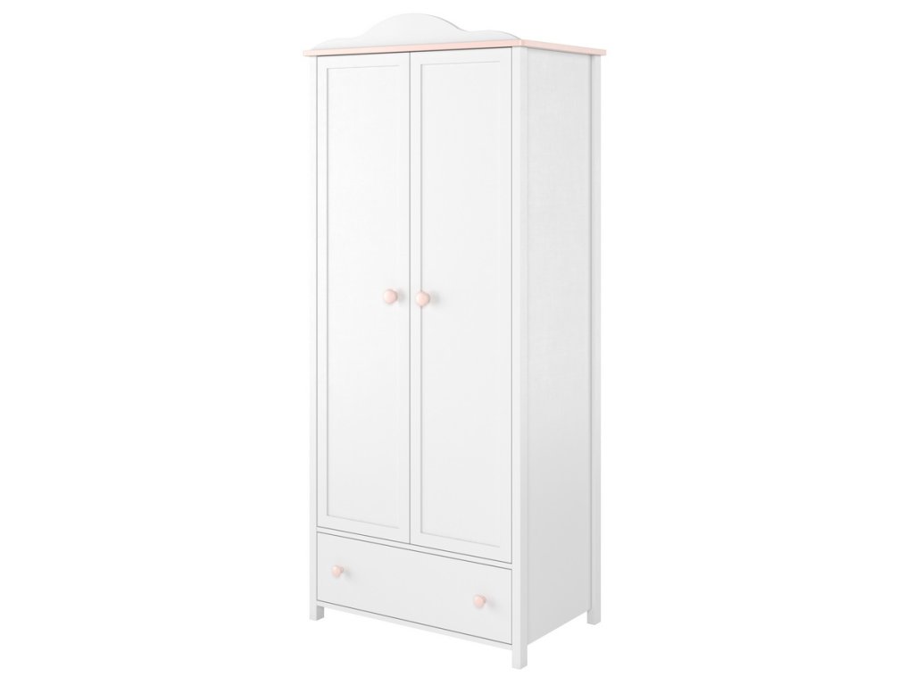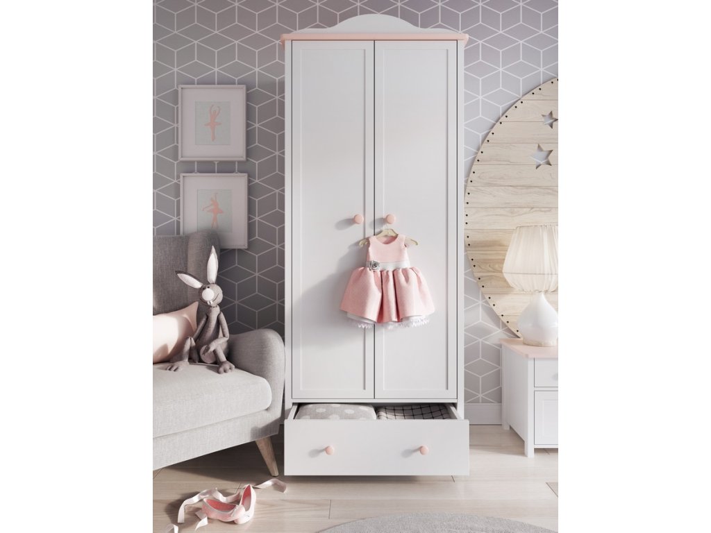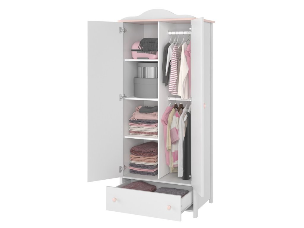 Dvoudveřová šatní skříň se zásuvkou. Tento elegantní nábytek dodá romantickou atmosféru pokojíčku malé princezny i větší slečny. Skříň je vyrobena z desky LTD v barvě bílé s doplňkovou barvou růžovou. Uvnitř skříně jsou 2 šatní tyče nad sebou v pravé části a v levé části skříně jsou police. Ve spodní části skříně je zásuvka. Úchyty jsou plastové v růžové barvě. Dodáváme v demontovaném stavu.Doplňkové parametry