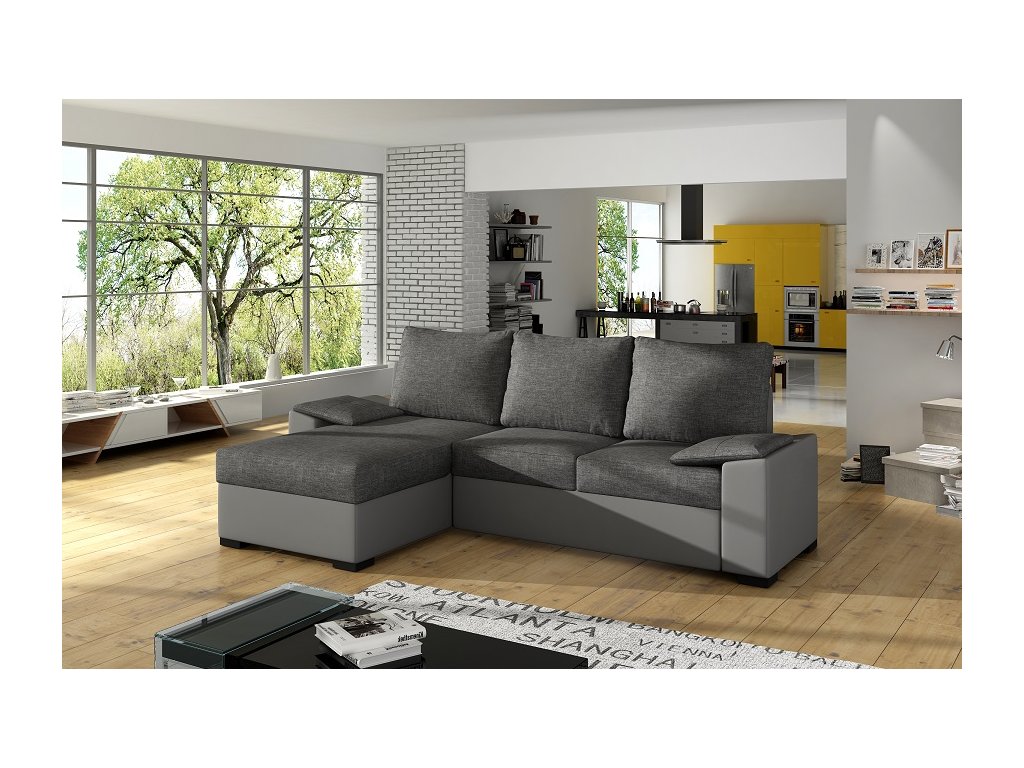 Rohová sedačka LUSSY má jednoduchý a moderní design. Díky svým rozměrům se hodí i do menších obýváků. Je vyrobena z pur pěny. Do sedáku byla použita odolná vlnovcová pružina. Sedačka disponuje praktickým úložným prostorem na ložní prádlo. Hloubka sedu je 57 cm, výška sedu je 42 cm. Určitě vás potěší, že má sedačka i funkci rozkladu – plocha na spaní má rozměr 145 x 205 cm. Je vhodná pro příležitostné spaní. Hloubka sedu je 57 cm, výška sedu je 42 cm. Sedačka je v barevném provedení látky Sawna 05 a ekokůže Soft 29, šedé a tmavě šedé barvy. Sedačka má univerzální provedení rohu, takže si ji smontujete dle vašich potřeb přímo na místě. Dodáváme v demontu.Doplňkové parametry