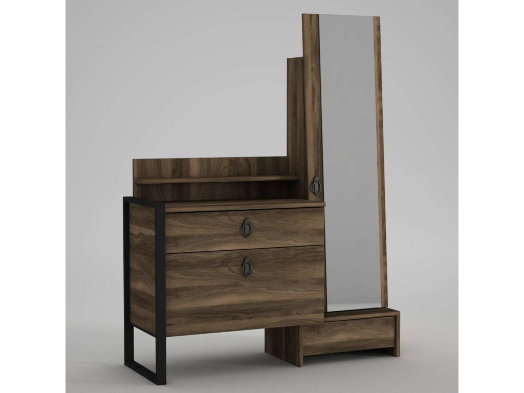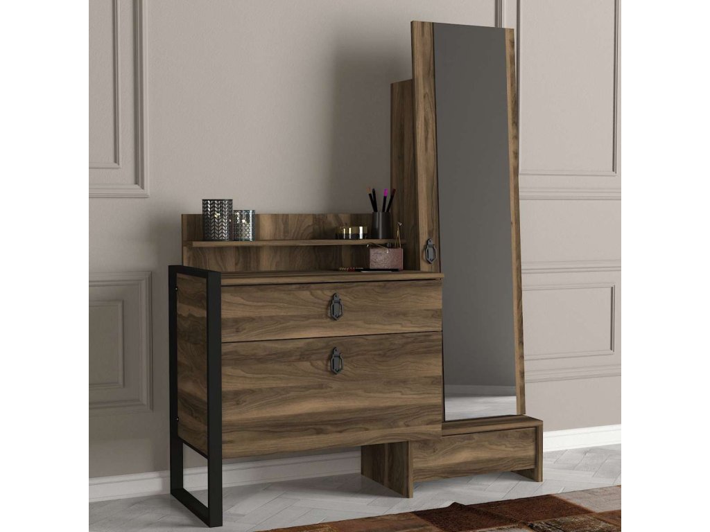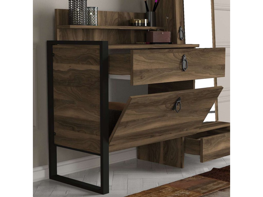 Toaletní stolek LUST je vyroben z kvalitního LTD materiálu o tloušťce 18 mm, doplněného kovovými a skleněnými prvky, což zajišťuje jeho dlouhou životnost a odolnost. Elegantní ořechová barva přinese do vaší ložnice moderní a sofistikovaný vzhled.