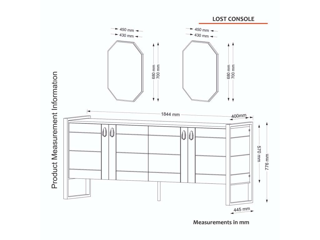 - Sestava obsahuje: Komoda (š180 x h40 x v78 cm), 2x nástěnné zrcadlo (š70 x h2 x v45 cm)