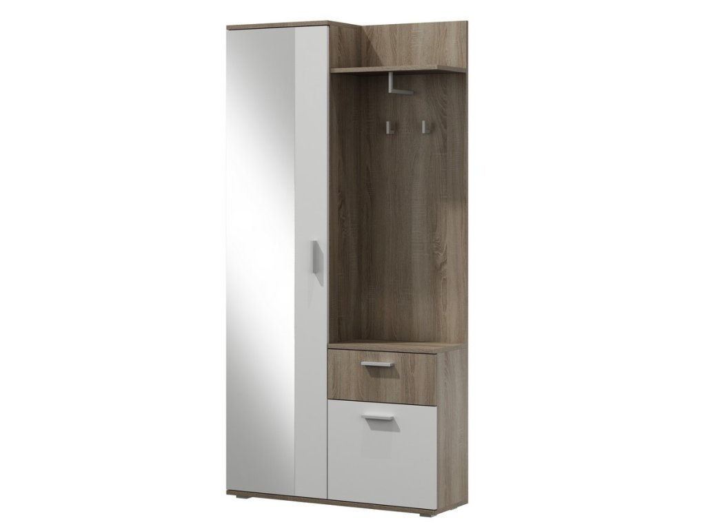 | Sestava obsahuje: | věšákový panel s policí, botník se zásuvkou a šatní skříň se zrcadlem |