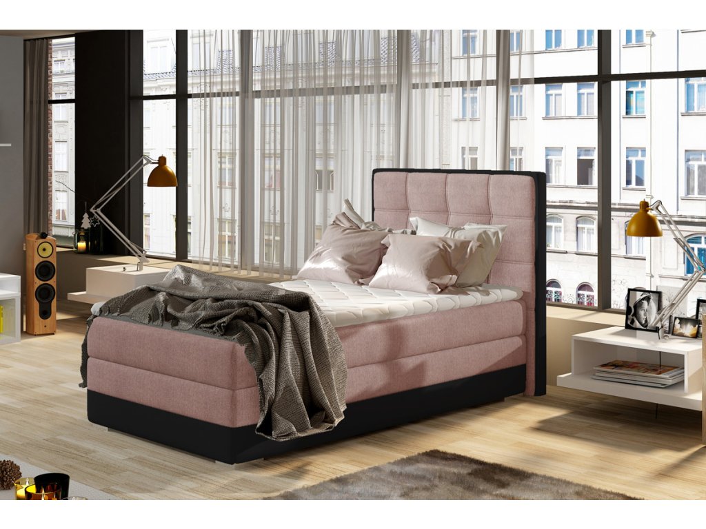 Postel BONAMI vás zaujme svým výjimečným vzhledem. Potěší i náročnější uživatele. Je vhodná do moderních dětských pokojů či ložnic. Postel je zajímavá svým vysokým čelem. Je celá čalouněná látkou Omega 91 v růžové barvě a ekokůží Soft 11v černém barevném provedení. Spací plocha je vyplněna bonelovými pružinami a kvalitní PUR pěnou. Disponuje praktickým úložným prostorem. Otevírání úložného prostoru pravé (viz. foto). V naší nabídce naleznete i levé otevírání úložného prostoru postele. Rozměry postele (š,v,h): 95 x 60/118 x 205 cm. Matrace o velikosti 90 x 200 cm je v ceně postele. Dodáváme v demontovaném stavu.Doplňkové parametry
