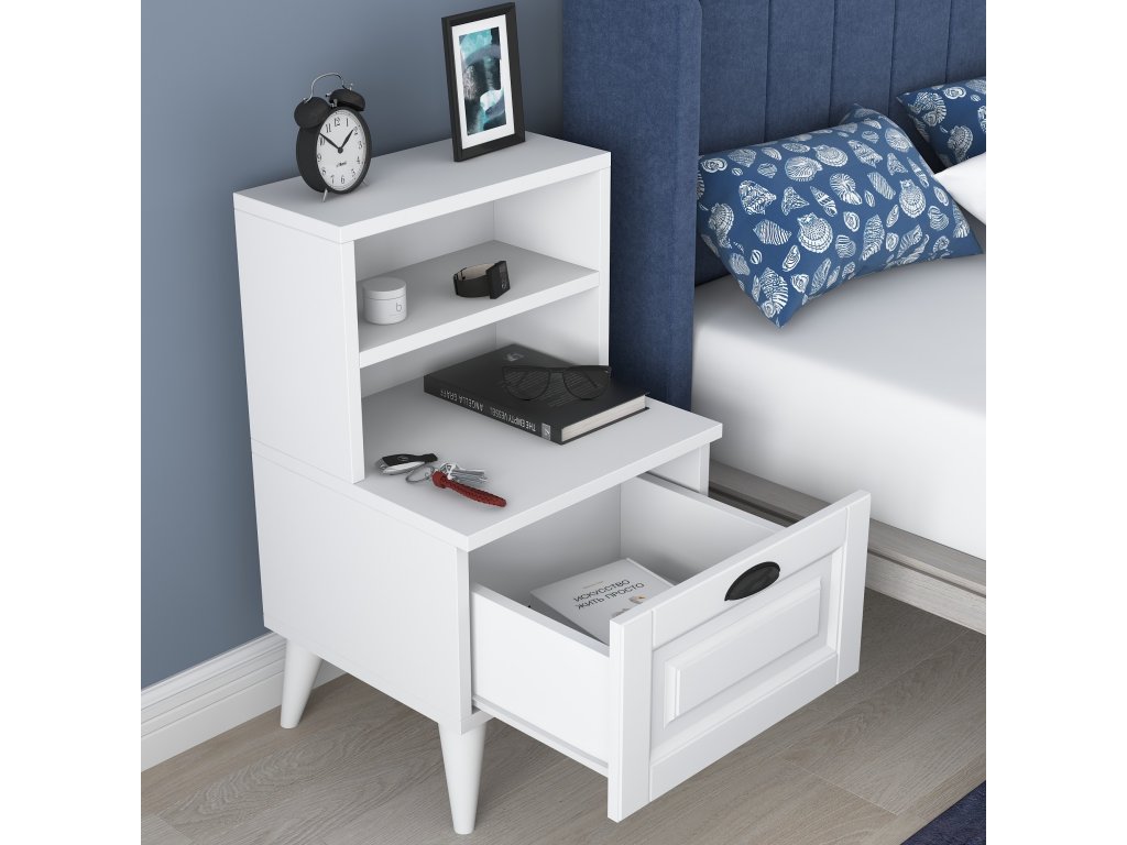 Noční stolek MABEL nabízí chytré uspořádání úložného prostoru a elegantní design, který zútulní vaši ložnici. Díky praktické zásuvce a regálku budete mít vše potřebné vždy po ruce.