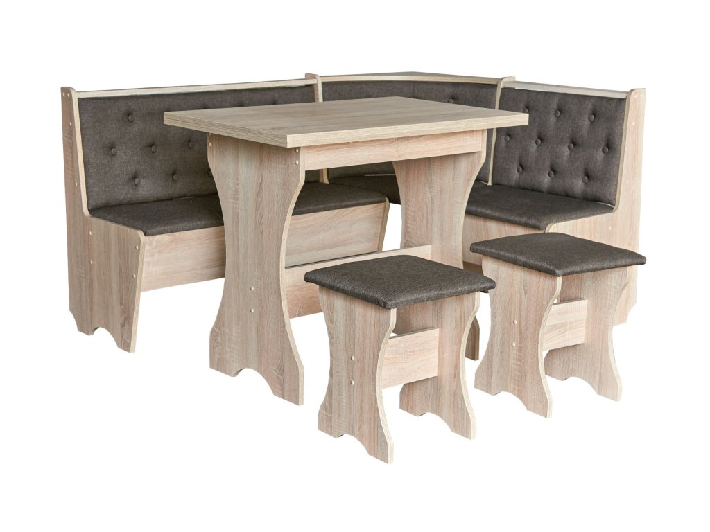 Čalouněný rohový kuchyňský set MAGDA poskytuje dostatek místa k sezení i uložení různých předmětů či zamaskování nepotřebných věcí. V kuchyňském setu se nachází: - rohová lavice, v/š/h: 80/153,5x113,5/34,5 cm - 2x taburetka, v/š/h: 43,5/35/35 cm, - rozkládací jídelní stůl, v/š/h: 76,2/89-118/59 cm. Nábytek je vyroben z velmi kvalitní a snadno udržitelné LTD desky. Barva stolu, taburetek a boků sedačky je dub sonoma. Sedací část je čalouněna světle hnědou látkou. Barva na obrázku může mít jiný odstín. Sestava má nenápadné černé nožičky. Jednotlivé prvky nelze zakoupit samostatně, sestavu lze zakoupit pouze jako celek. Dodáváme v demontu, přičemž montáž je velmi jednoduchá.Doplňkové parametry