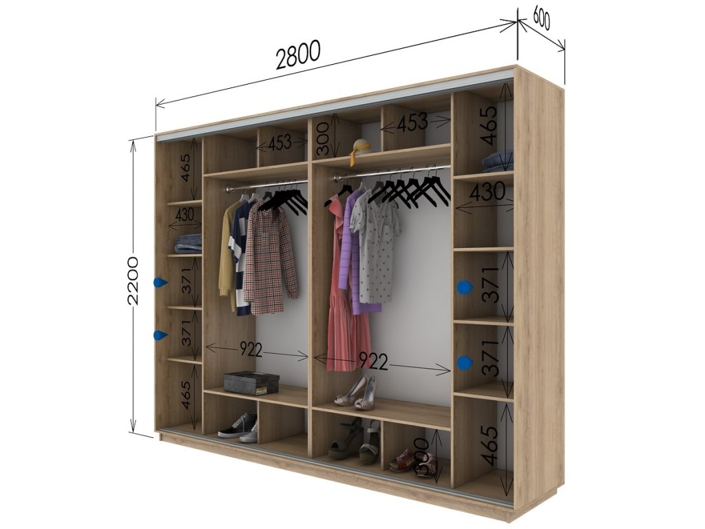 Rozměry úložných částí si můžete prohlédnout na fotce. Skříň je členěna na policovou a závěsnou část se 2 závěsnými tyčemi. Korpus skříně je vyroben z kvalitní LTD desky.