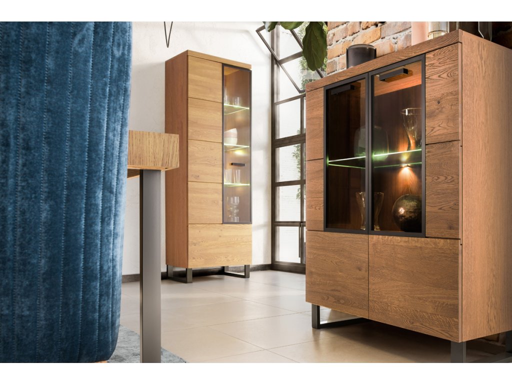 Vnější korpus je vyroben z přírodní dubové dýhy. Vnitřní korpus je z kvalitních LTD desek, které jsou potaženy fólií v dekoru dřeva. Přední část nábytku je z masivu dubového dřeva. Úchyty a nožičky jsou vyrobeny z kovu, v černé barvě. Nábytek je v barvě: dub rustikál, černá.