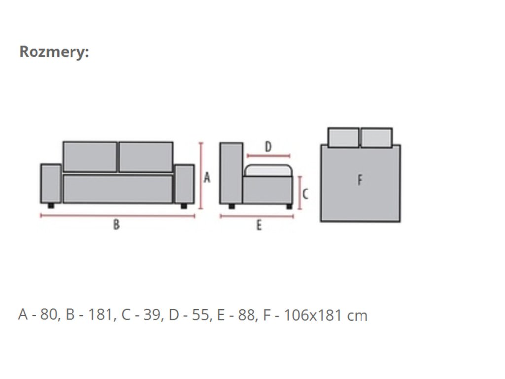 Akční cena je za zboží skladem. Stylová pohovka MALOKY nabízí stylový design s nádechem luxusu. Je vhodná do menšího obývacího pokoje, pracovny, dětského pokoje nebo větší vstupní haly. Zaujme Vás efektní prošití, ale zejména vysoké nožičky ve zlatém lesklém provedení. Jednoduchým způsobem ji dokážete rozložit a vytvořit si tak spací plochu pro příležitostné spaní. Plocha na spaní: (ŠxD) 106 x 181 cm. Pohovka je čalouněna kvalitní látkou AKSAMIT typ 157 v šedém barevném provedení. V naší nabídce naleznete i další barevná provedení. Další rozměry: šířka: 181 cm výška: 80 cm hloubka: 88 cm hloubka sedu: 55 cm výška sedu: 39 cm. Barvy, které zobrazuje Váš monitor se mohou mírně lišit od originálu.Doplňkové parametry