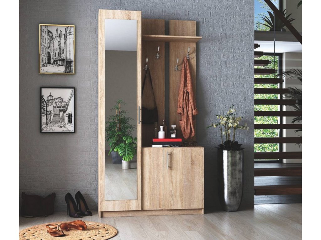 MANOLA předsíň patří k menším nábytkům. Je ideální do malých prostor, ale své využití najde i ve velké hale. Zachová přitom vzdušnost prostoru a dodá styl místnosti. Tento nábytek je navržen v klasickém designovém provedení i barvě. Nabízí šatní skříň i prostor pro uložení bot. Oceníte také velké zrcadlo umístěné na dveřích skříně. Součástí sestavy je také věšáková stěna se 4 háčky ve stříbrné barvě a horní polička. Nábytek je vyroben z kvalitní LTD desky, která není náročná na údržbu. Barevné provedení: dub sonoma. Celkové rozměry předsíně jsou (v/š/h): 200 x 103,2 x 35 cm. Dodáváme v demontu.Doplňkové parametry